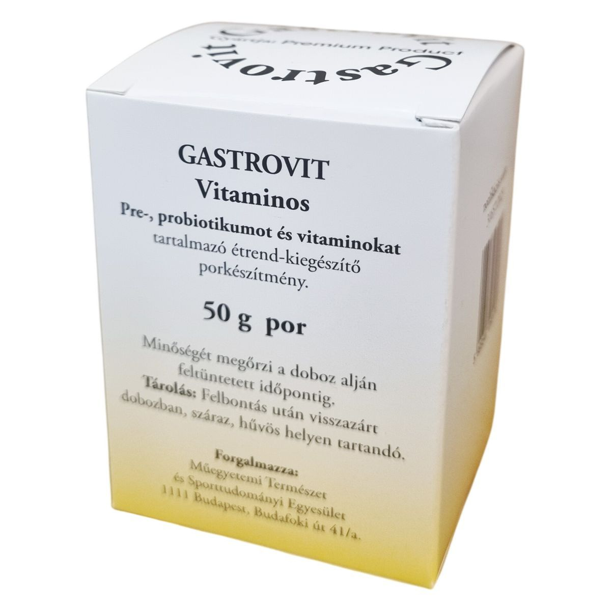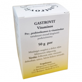A Gastrovit Vitaminos por prebiotikumokat, élőflórás probiotikumokat és vitaminokat tartalmazó étrend-kiegészítő készítmény, amely segítheti a bélflóra helyreállítását és az immunrendszer támogatását. Kiszerelés: 50 g por. Előállítja: Premium Product Kft.