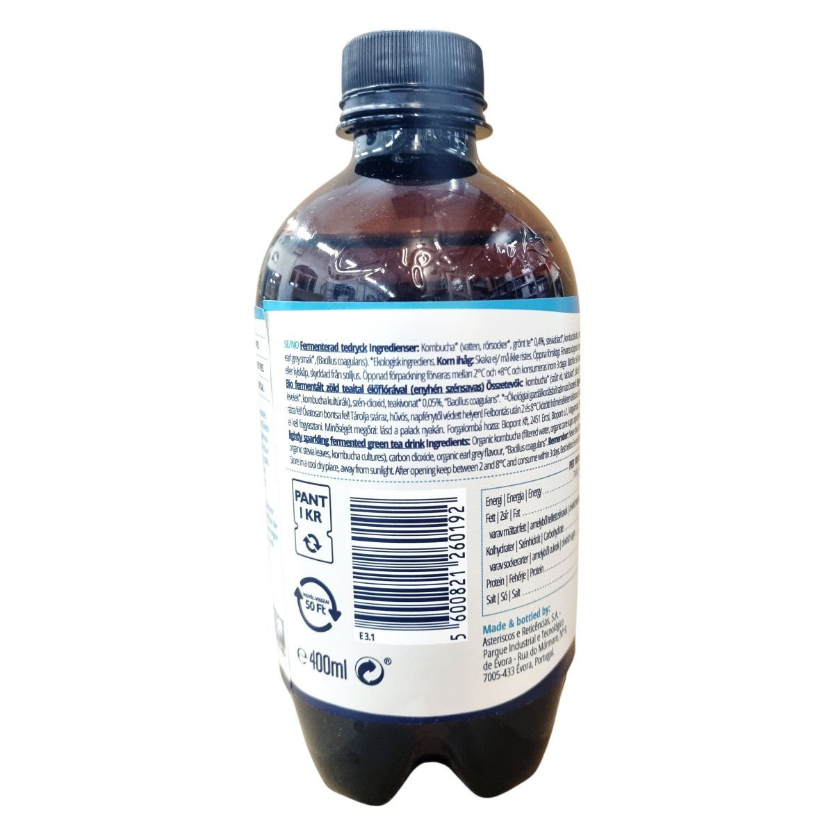 kombucha (szűrt víz, nádcukor, zöld tea 0,4%, stevia levél, kombucha kultúrák), szén-dioxid, teakivonat 0,05%, Bacillus coagulans