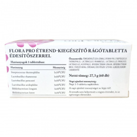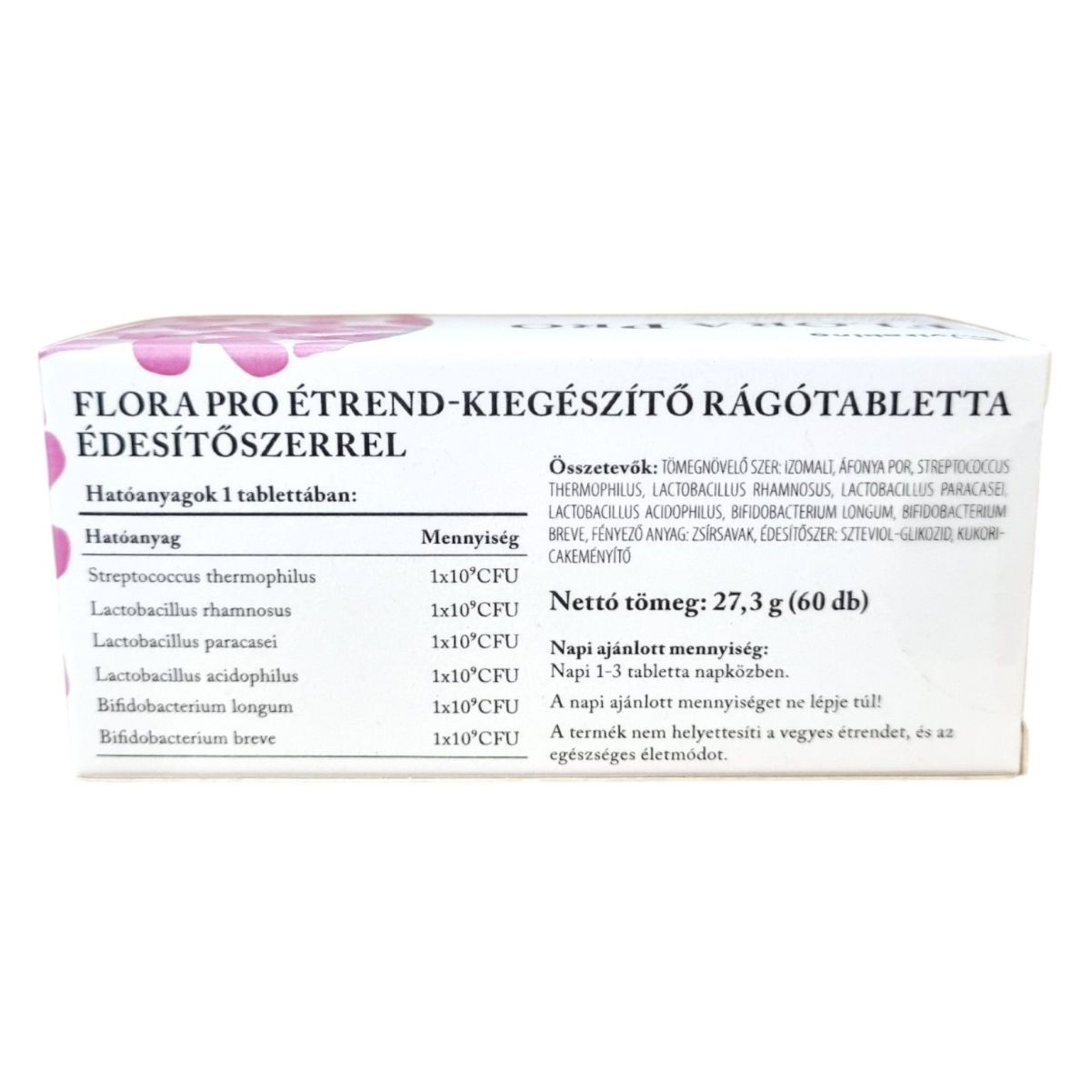 A FLORA PRO rágótabletta élőflórát tartalmaz, amely hozzájárulhat az emésztőrendszer egészségéhez. Áfonya ízű, édesítőszerrel készült, és különböző probiotikus törzseket tartalmazhat.