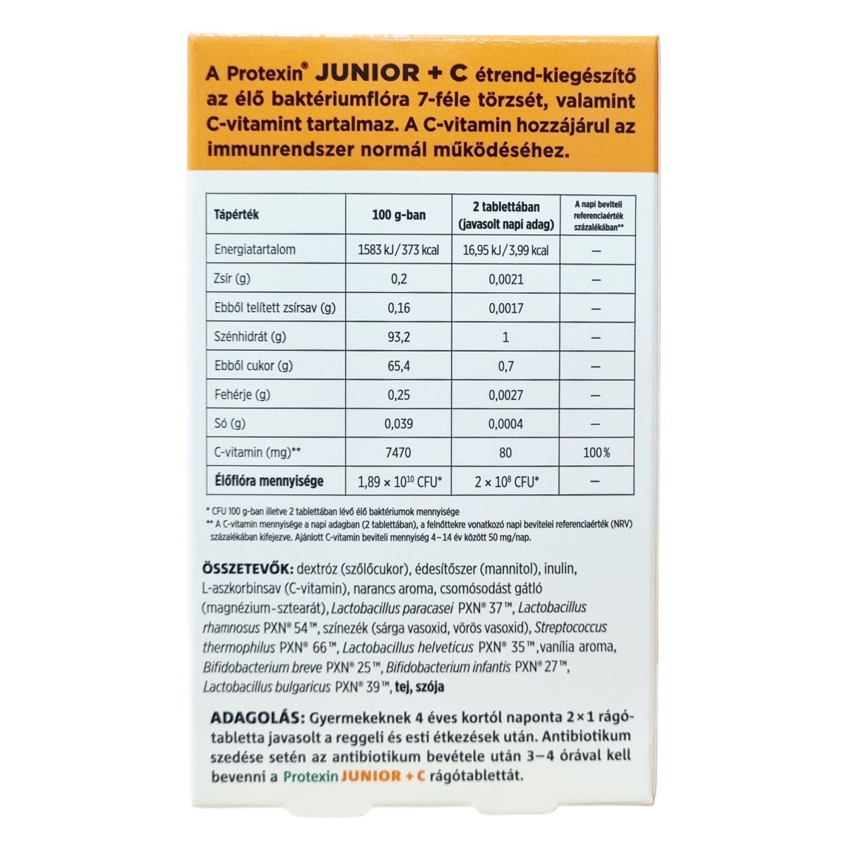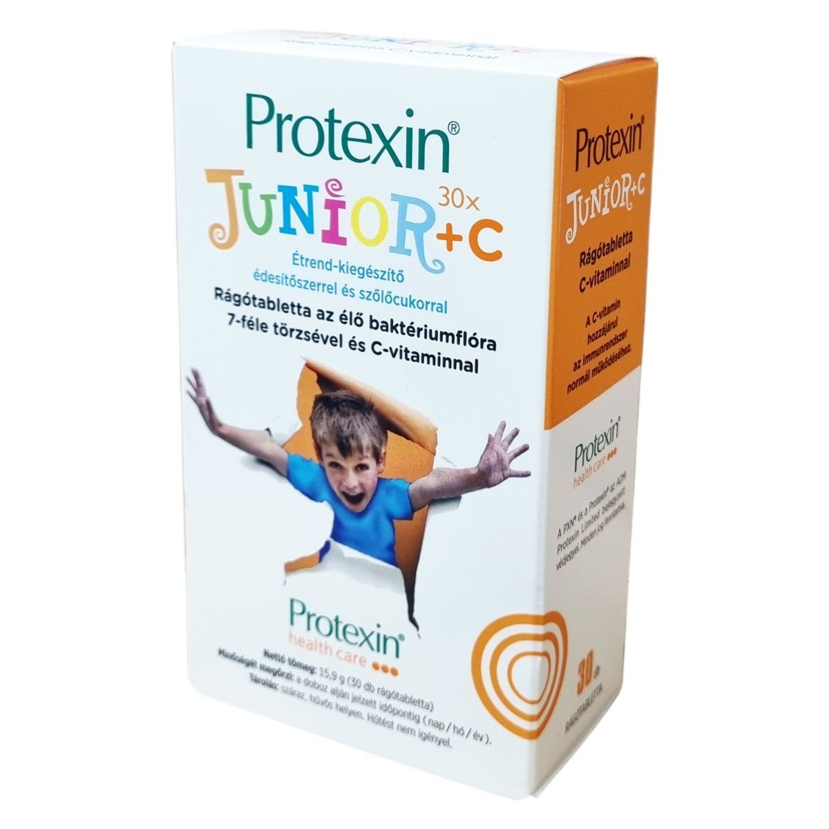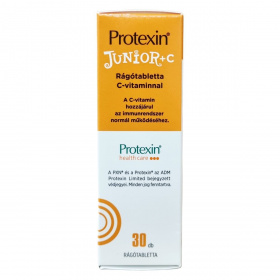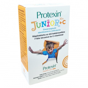 A Protexin® JUNIOR + C étrend-kiegészítő 7-féle élő baktériumtörzset és C-vitamint tartalmaz. A C-vitamin a napi beviteli referenciaérték 100%-át biztosítja két tablettában, mely hozzájárulhat az immunrendszer normál működéséhez. A termék édesítőszerrel és szőlőcukorral készül narancs és vanília aromával ízesítve. Allergének közül szója és tej található meg a fermentáció során felhasznált anyagok között, de a tej mennyisége nem befolyásolja azokat, akik laktózintoleranciában szenvednek. A termék nem alkalmas 4 év alatti gyermekek számára, és nem helyettesíti a változatos étrendet. A doboz 30 db rágótablettát tartalmaz, melynek nettó tömege 15,9 g. A Protexin® márkanév és PXN® védjegyek az ADM Protexin Limited tulajdonát képezik.