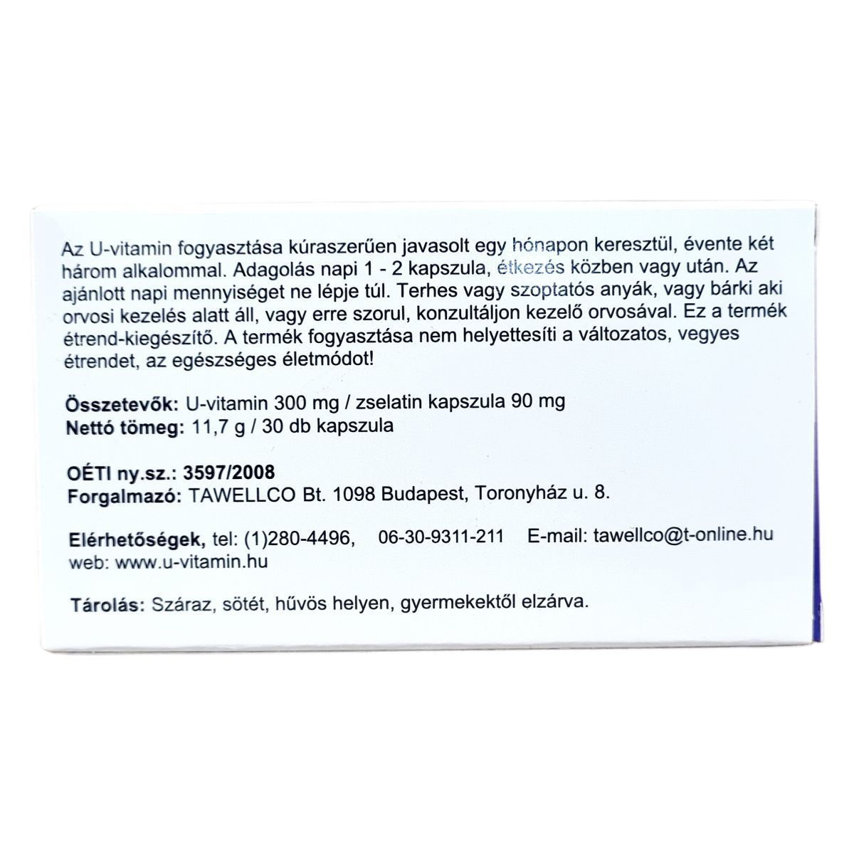 Az U-vitamin kapszula elsősorban az immunrendszert erősítheti, valamint segítheti a sejtek regenerációját. A termék kúraszerű fogyasztása ajánlott, mely napi 1-2 kapszula bevételét jelenti étkezés közben vagy után, egy hónapon keresztül, évente 2-3 alkalommal. A termék kizárólag étrend-kiegészítőként használható, nem helyettesíti a változatos, vegyes étrendet és az egészséges életmódot. A csomagolás 30 kapszulát tartalmaz, nettó tömege 11,7 g. A termék tárolása száraz, sötét és hűvös helyen javasolt, gyermekektől elzárva. Az esetleges orvosi kezelés alatt állóknak vagy terhes és szoptató nőknek ajánlott a termék használata előtt szakorvosukkal történő konzultáció.