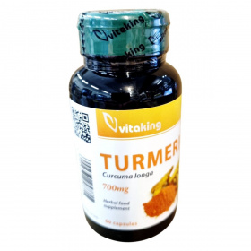 A Vitaking Turmeric étrend-kiegészítő 700 mg kurkuma gyökér port tartalmaz kapszulánként. A termék 60 kapszulás kiszerelésben kapható, és napi 3 kapszula fogyasztása javasolt étkezés közben. A kurkuma, mint fő összetevő, hozzájárulhat az emésztés támogatásához és a gyulladásos folyamatok enyhítéséhez. A termék nem helyettesíti a vegyes étrendet és az egészséges életmódot, valamint bizonyos egészségügyi állapotok esetén nem ajánlott a fogyasztása. Tárolása száraz, hűvös helyen javasolt, gyermekek elől elzárva.