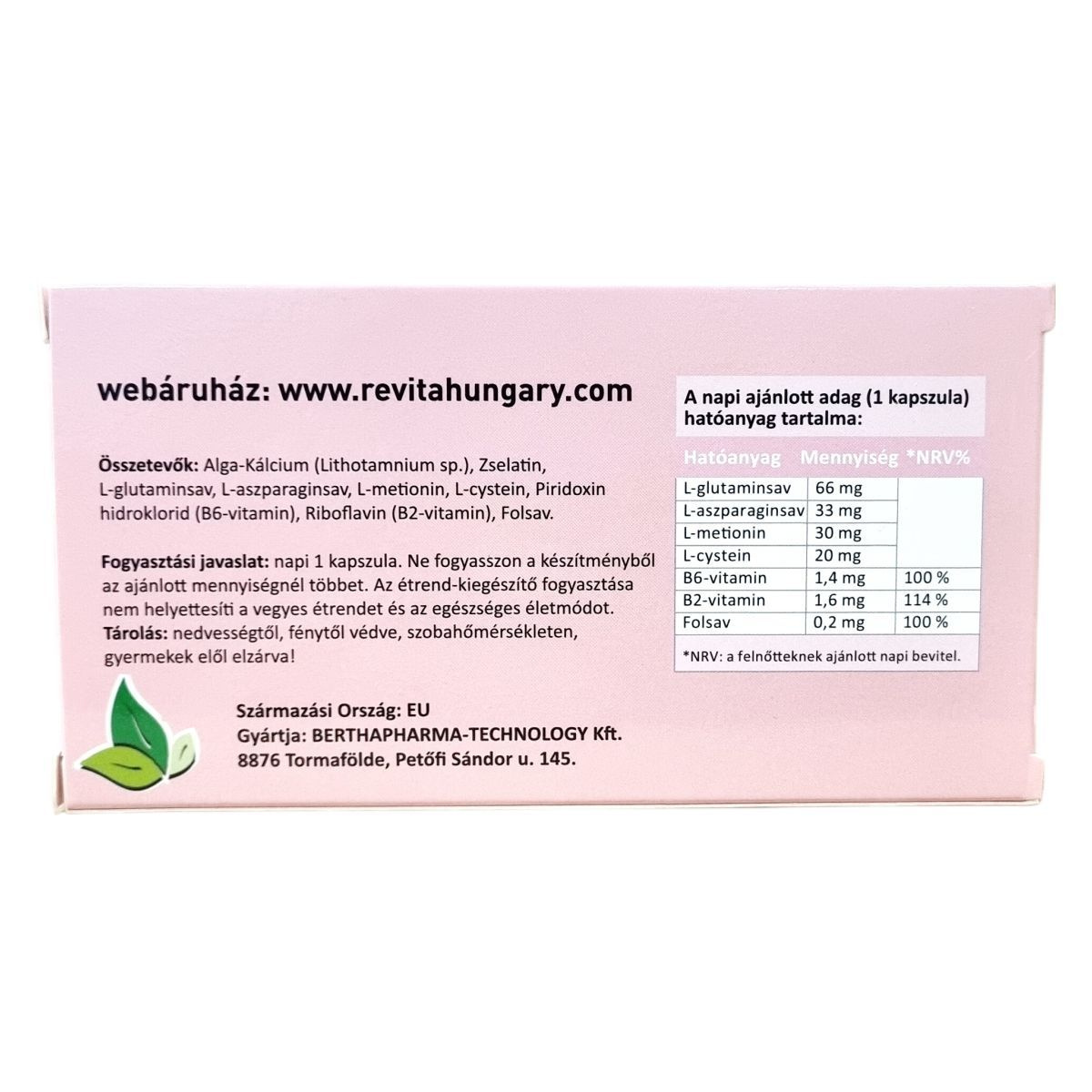 A Revita HUNGARY étrend-kiegészítő kapszula 30 darabos kiszerelésben készül, összesen 17 gramm tömegben. Az alapját alga-kálcium képezi, amely mellett többféle aminosavat és B-vitaminokat tartalmaz. A hatóanyagok között megtalálható a L-glutaminsav, L-aszparaginsav, L-metionin, L-cystein, valamint a B6- és B2-vitaminok, illetve folsav. A termék származási országa az Európai Unió, és a BERTHAPHARMA-TECHNOLOGY Kft. gyártja. A kapszulák zselatinból készülnek, és a napi ajánlott fogyasztása 1 kapszula. A termék tárolásakor ügyelni kell a nedvességtől és fénytől való védelemre, továbbá gyermekek elől elzárva kell tartani.