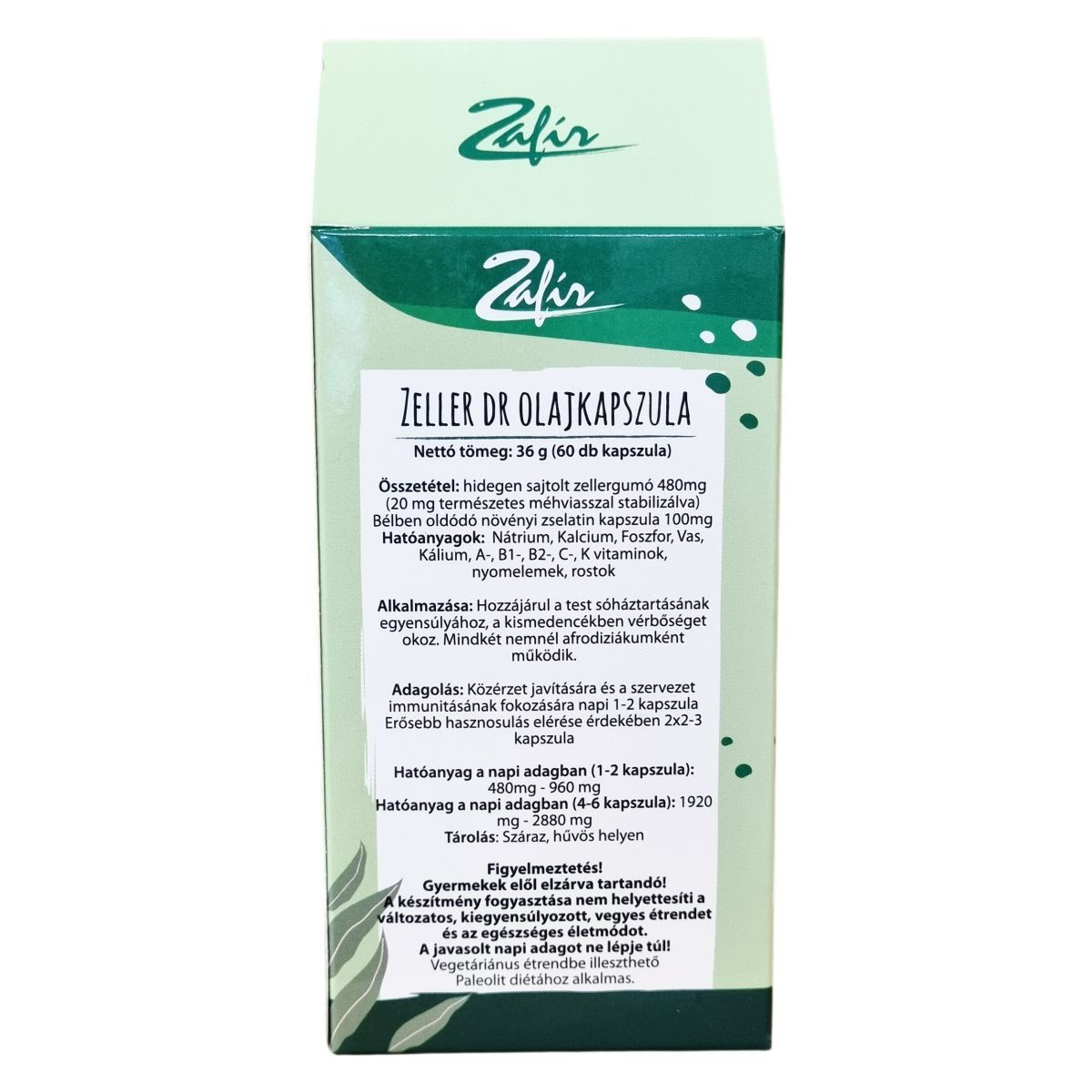 Hidegen sajtolt zellergumó 480 mg, természetes méhviasz 20 mg, bélben oldódó növényi zselatin kapszula 100 mg