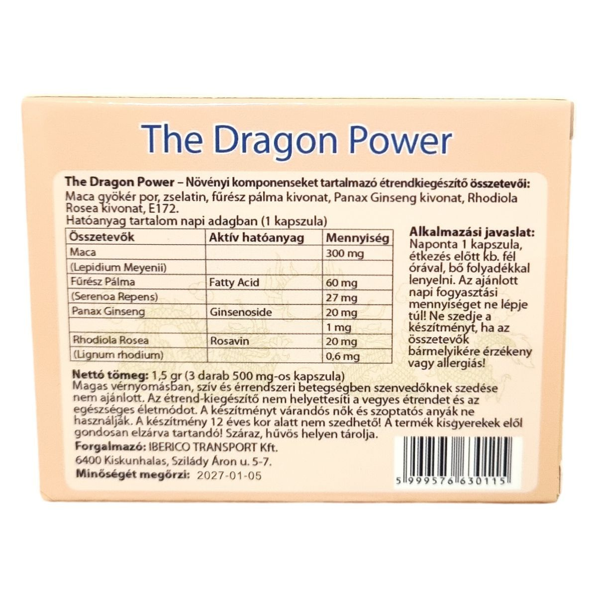 A The Dragon Power termék természetes növényi összetevőket tartalmazó étrend-kiegészítő, amely Maca gyökérből, fűrész pálma kivonatból, Panax Ginseng kivonatból és Rhodiola Rosea kivonatból áll. Ezek a komponensek hozzájárulhatnak a szervezet egészséges működésének támogatásához. A napi adag egy kapszula, amelyet étkezés előtt fél órával kell bevenni. Fontos, hogy az ajánlott adagolást ne lépje túl, és figyelembe vegye az ellenjavallatokat, továbbá a készítmény nem helyettesíti a kiegyensúlyozott étrendet vagy egészséges életmódot. A termék Kínában készül.