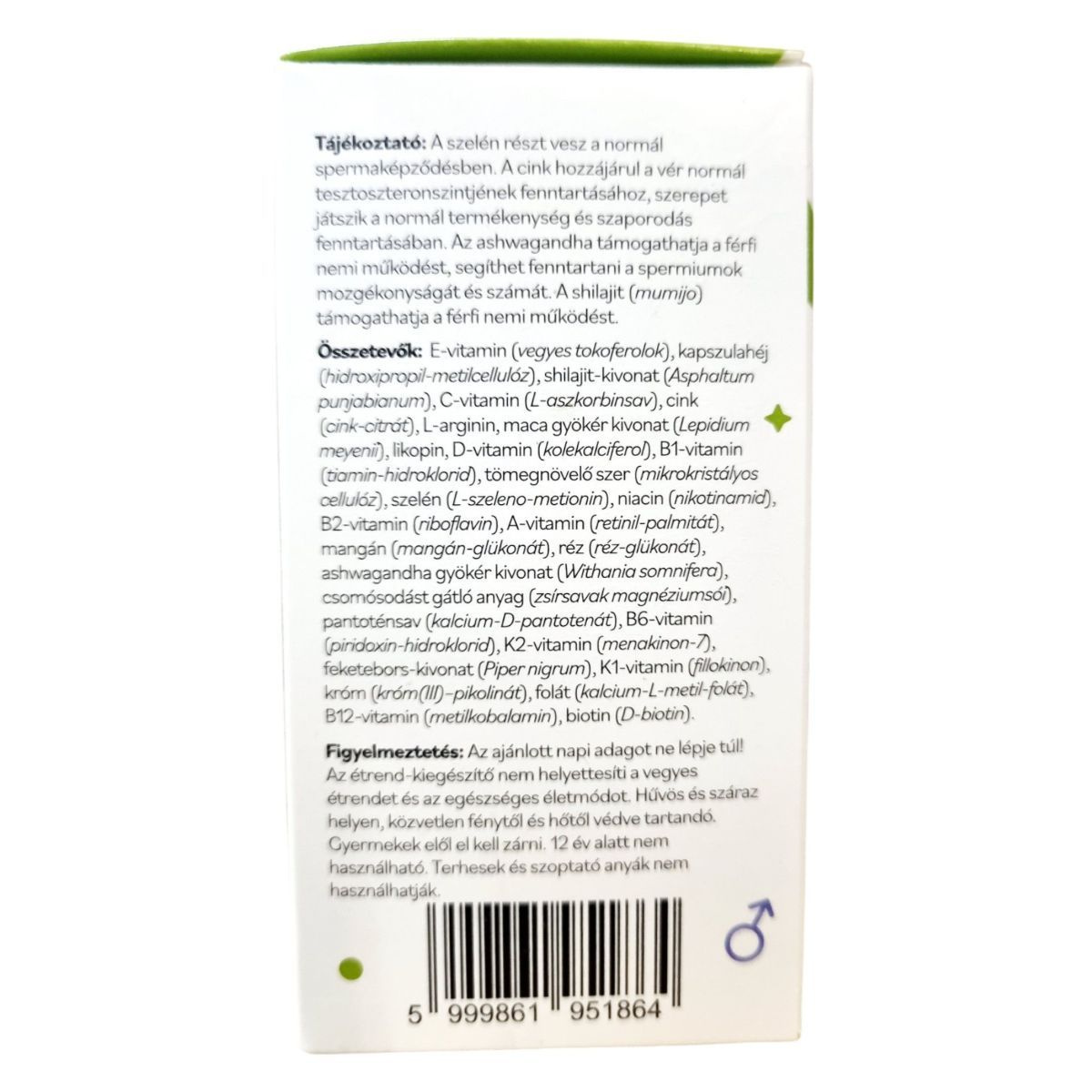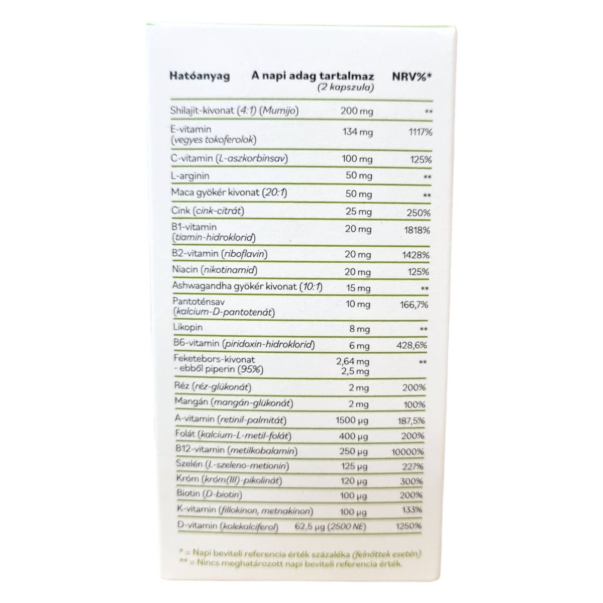 E-vitamin, kapszulahéj (hidroxi-propil-metilcellulóz), shilajit-kivonat, C-vitamin, cink, L-arginin, maca gyökér kivonat, likopin, D-vitamin, B1-vitamin, tömegnövelő szer (mikrokristályos cellulóz), szelén, niacin, riboflavin, mangán, réz, ashwagandha gyökér kivonat, csomósodást gátló anyag (zsírsavak magnézium sói), pantoténsav, B6-vitamin, K2-vitamin, feketebors-kivonat, K1-vitamin, króm, folát, B12-vitamin, biotin.
