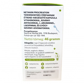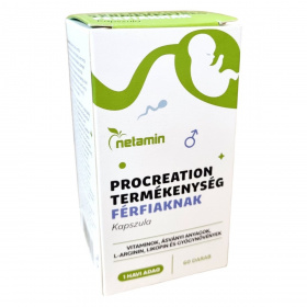 A Netamin ProCreation termékenység támogatására kifejlesztett étrend-kiegészítő férfiak számára. A termék vitaminokat, ásványi anyagokat, L-arginint, likopint és különféle gyógynövény-kivonatokat tartalmaz, mint például shilajit, maca és ashwagandha. Ezek az összetevők hozzájárulhatnak a normál spermaképződéshez, a vér normál tesztoszteronszintjének fenntartásához, valamint a férfi nemi működés támogatásához. A termék napi adagja két kapszula, amelyet bő folyadékkal, lehetőleg étkezés közben ajánlott bevenni. A termék nem helyettesíti a vegyes étrendet és az egészséges életmódot, és nem ajánlott 12 év alatti gyermekek, terhesek és szoptatók számára.