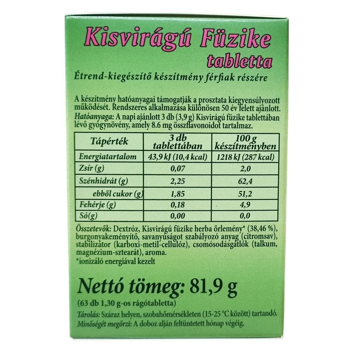 A készítmény hatóanyagai a Kisvirágú füzike gyógynövényből származnak, mely ionizáló energiával kezelt. A termék nettó tömege 81,9 g, amely 63 darab, 1,30 g-os rágótablettából áll. A tárolás során fontos a megfelelő hőmérsékleti körülmények betartása, továbbá a termék megfelel az élelmiszerbiztonsági előírásoknak, és az OÉTI által jóváhagyott notifikációs számmal rendelkezik. Az adagolás során a tablettákat javasolt szétrágni vagy eltörni, majd folyadékkal bevenni, és a felhasználás elsősorban 50 év feletti férfiaknak ajánlott a prosztata támogatására.