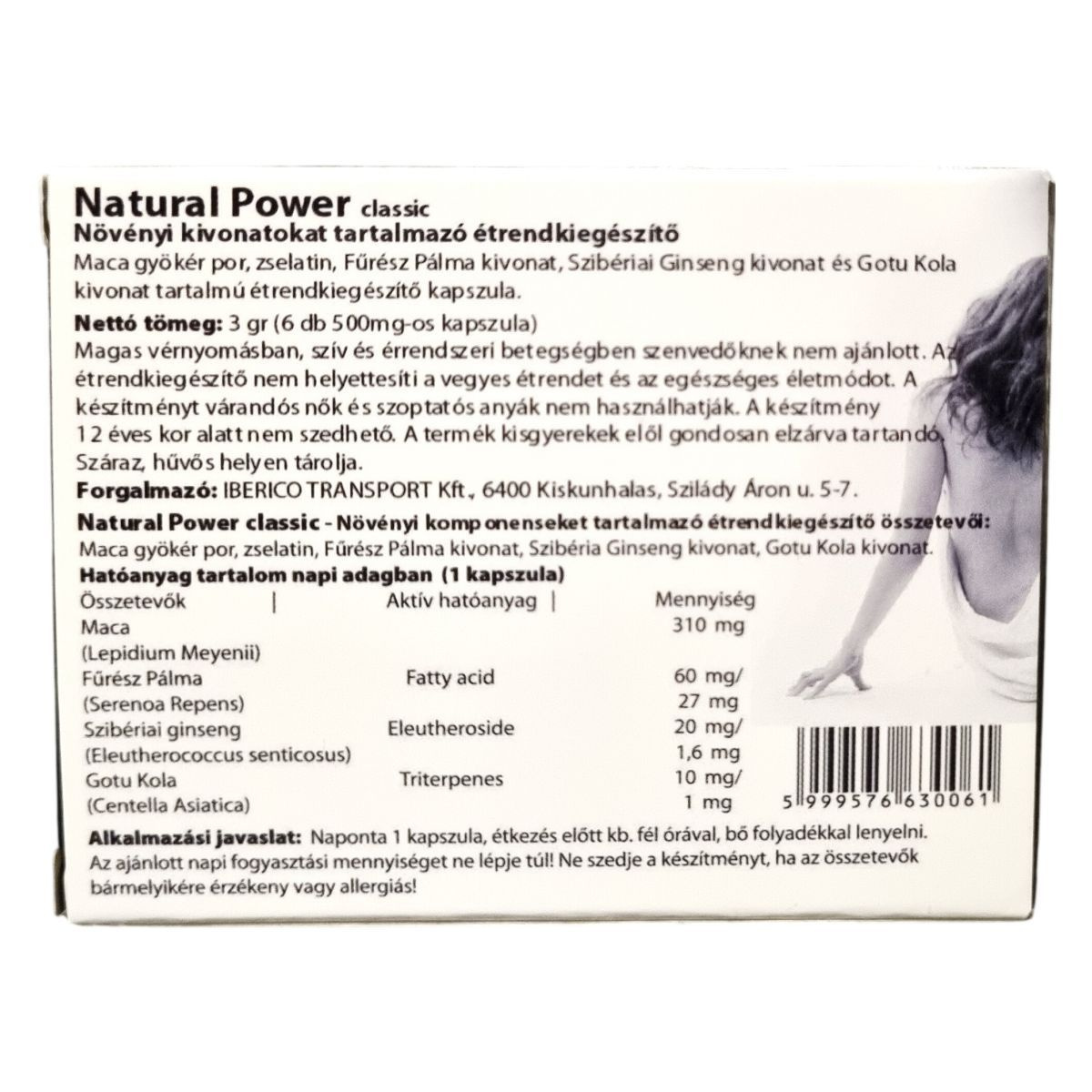 A Natural Power classic kapszula nettó tömege 3 gramm, és 6 darab 500 mg-os kapszulát tartalmaz. A termék növényi kivonatokból áll, melyek között szerepel a maca gyökér por, fűrész pálma kivonat, szibériai ginseng kivonat és gotu kola kivonat. Ezek a hatóanyagok hozzájárulhatnak a szervezet egészséges működésének támogatásához. Fontos figyelmet fordítani arra, hogy a termék alkalmazása előtt figyelembe kell venni az ellenjavallatokat, és nem helyettesíti a kiegyensúlyozott táplálkozást és az egészséges életmódot.