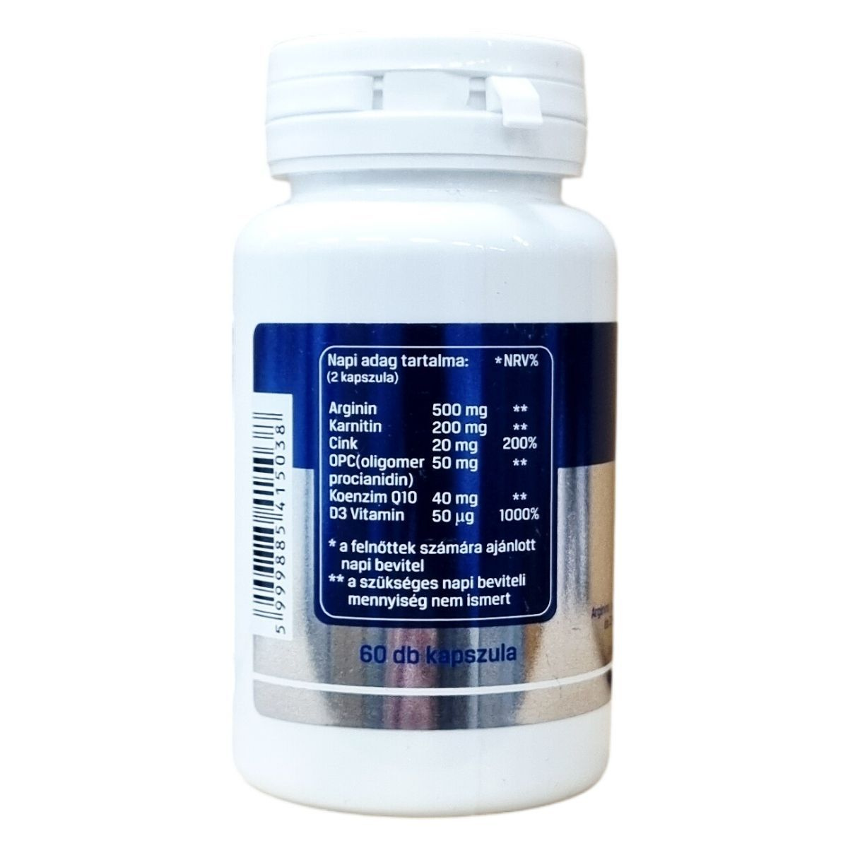 Hatóanyagok: arginin, karnitin, fenyőkéreg kivonat, Koenzym Q10, D-vitamin és cink.