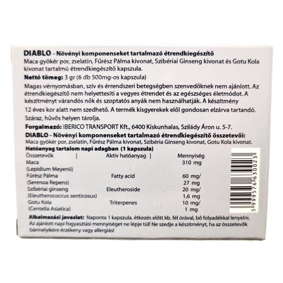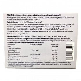 A Diablo étrendkiegészítő kapszula 6 darab 500 mg-os kapszulát tartalmaz, összesen 3 gramm nettó tömeggel. Kapszulánként a Maca gyökér por, Fűrész Pálma kivonat, Szibériai Ginseng kivonat és Gotu Kola kivonat van jelen, melyek mind növényi eredetűek. A termék nem helyettesíti a kiegyensúlyozott vegyes étrendet és az egészséges életmódot. A készítmény kifejezetten nem ajánlott magas vérnyomás, illetve szív- és érrendszeri betegségek esetén, illetve várandós és szoptató nők, valamint 12 éven aluli gyermekek részére. A terméket gyermekektől távol kell tartani.