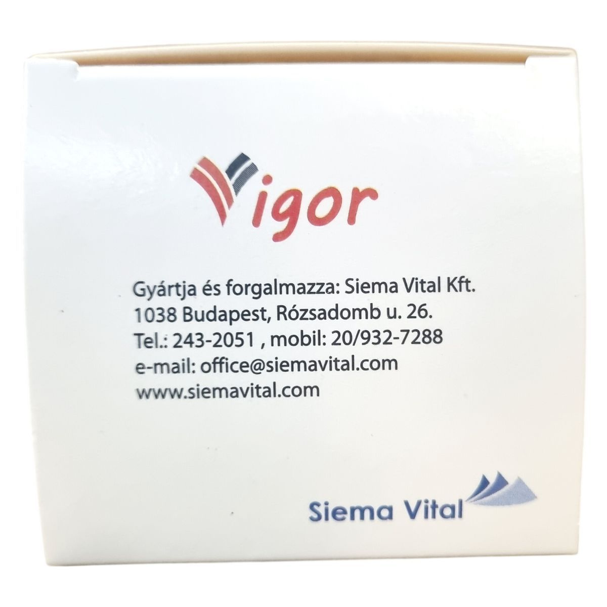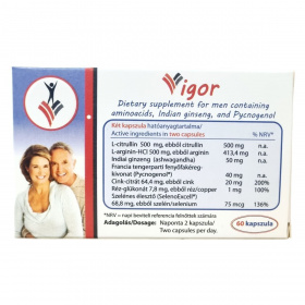 A Vigor kapszula olyan összetevőket tartalmaz, mint L-citrullin, L-arginin-hidroklorid, szelénes-élesztő (SelenoExcell®), indiai ginzeng (ashwagandha) kivonat, valamint a 65-75% procyanidin-tartalmú francia tengerparti fenyőfakéreg-kivonat (Pycnogenol®). A Pycnogenol® a Horphag Research Ltd. bejegyzett védjegye, alkalmazását több amerikai és nemzetközi szabadalom védi. A SelenoExcell® a Cypress Systems, Inc. bejegyzett védjegye. A termék 60 kapszulás kiszerelésben kerül forgalomba, és az adagolás naponta két kapszula. A készítmény tartalmaz zselatint és emulgeálószereket (mikrokristályos cellulóz, magnézium-sztearát), valamint titán-dioxidot, mint színanyagot. A termék kizárólag felnőttek részére ajánlott, 12 év alattiak, terhes és szoptató nők számára nem használható.