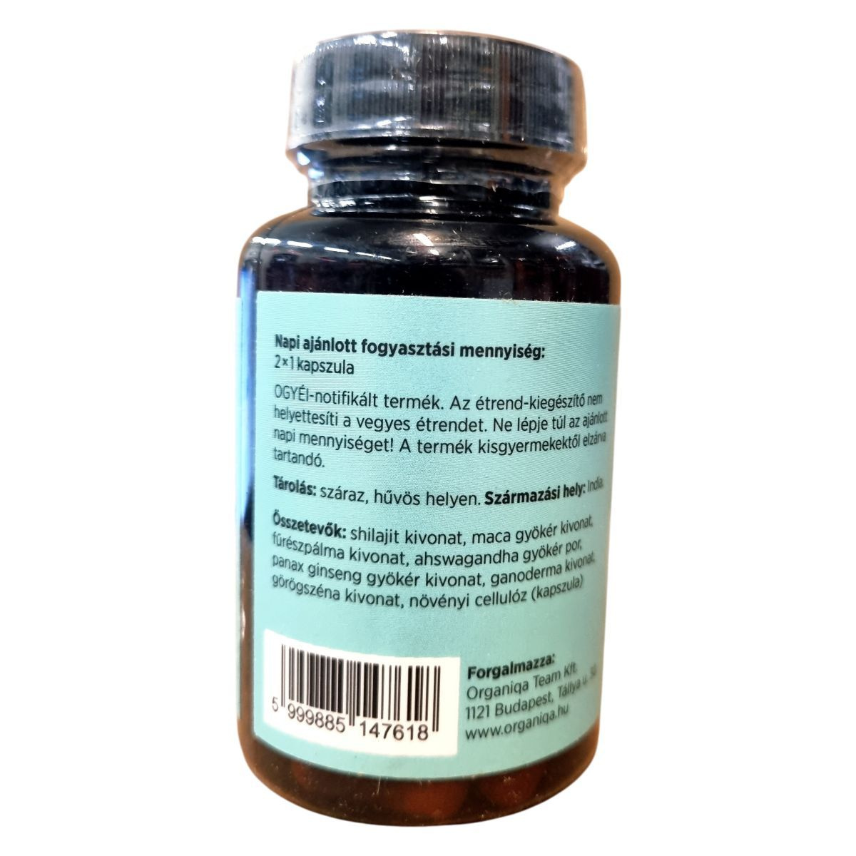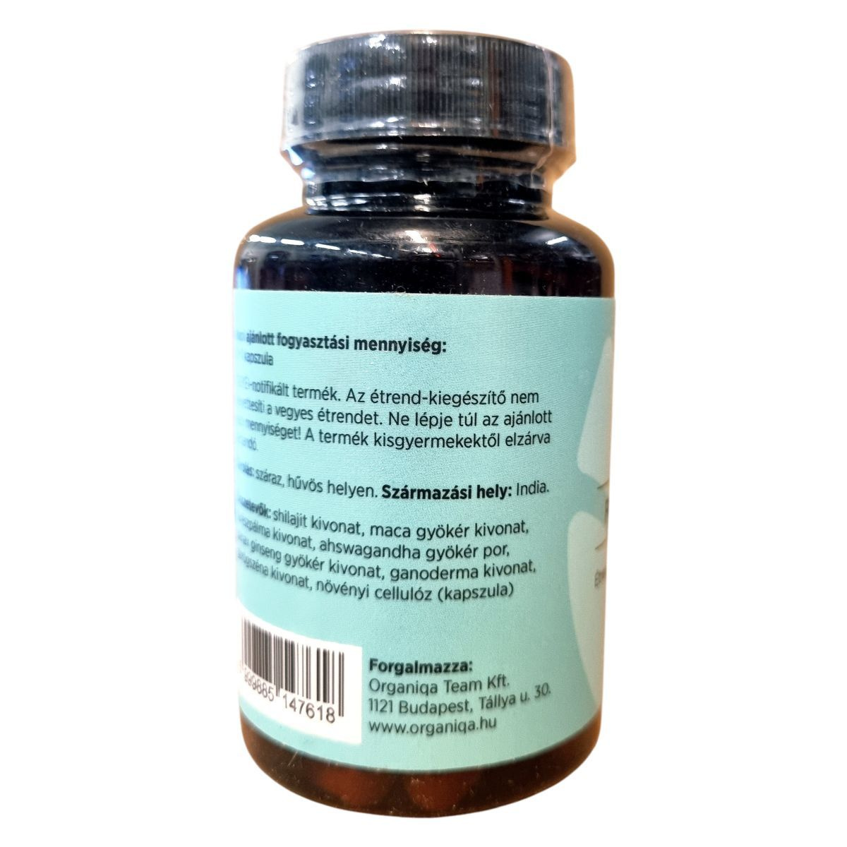shilajit kivonat, maca gyökér kivonat, fűrészpálma kivonat, ashwagandha gyökér por, panax ginseng gyökér kivonat, ganoderma kivonat, görögszéna kivonat, növényi cellulóz (kapszula)