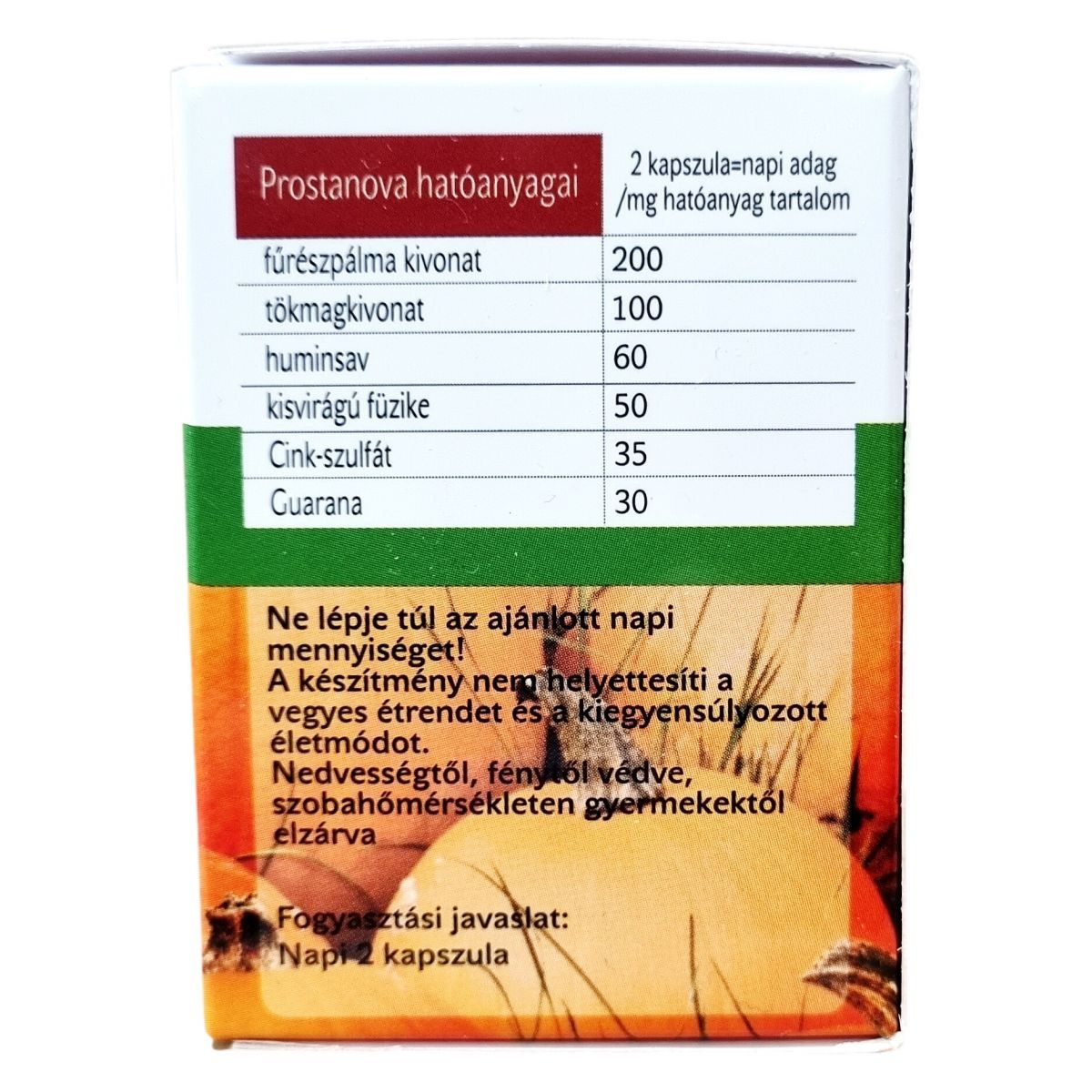 fűrészpálma kivonat, tökmagkivonat, zselatin (kapszula), huminsav, kisvirágú füzike, Cink-szulfát, Guarana, Alga-kálcium (Aquamin S)