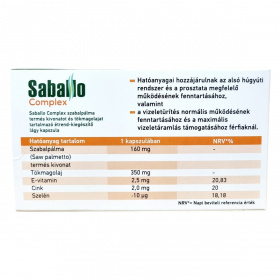 A Saballo Complex lágy kapszula szabalpálma termés kivonatot és tökmagolajat tartalmaz, amelyek hozzájárulhatnak a prosztata és az alsó húgyúti rendszer megfelelő működésének fenntartásához. Ezen felül támogathatják a vizeletürítés normális működését és a maximális vizeletáramlást férfiaknál. A kapszula további összetevői között található E-vitamin, cink és szelén, melyek szintén fontos tápanyagok lehetnek ezen területek egészsége szempontjából. A termék használata során fontos betartani az ajánlott napi adagolást, és figyelembe venni az ellenjavallatokat és a gyermekek részére történő korlátozásokat is.