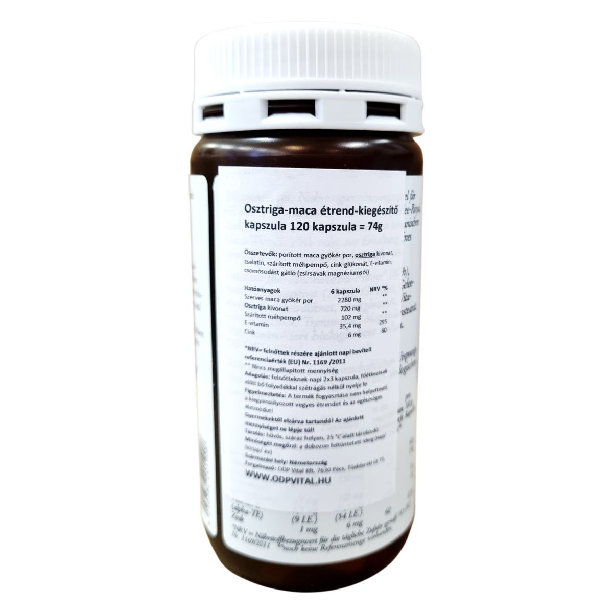 Az osztriga-maca kapszula étrend-kiegészítő Németországban készül. A készítmény maca gyökér port, osztriga kivonatot, méhpempőt, valamint cinket és E-vitamint tartalmaz. A napi adag 6 kapszula, amelyhez a hatóanyag-mennyiségek meg vannak adva. A terméket elegendő folyadékkal kell bevenni.