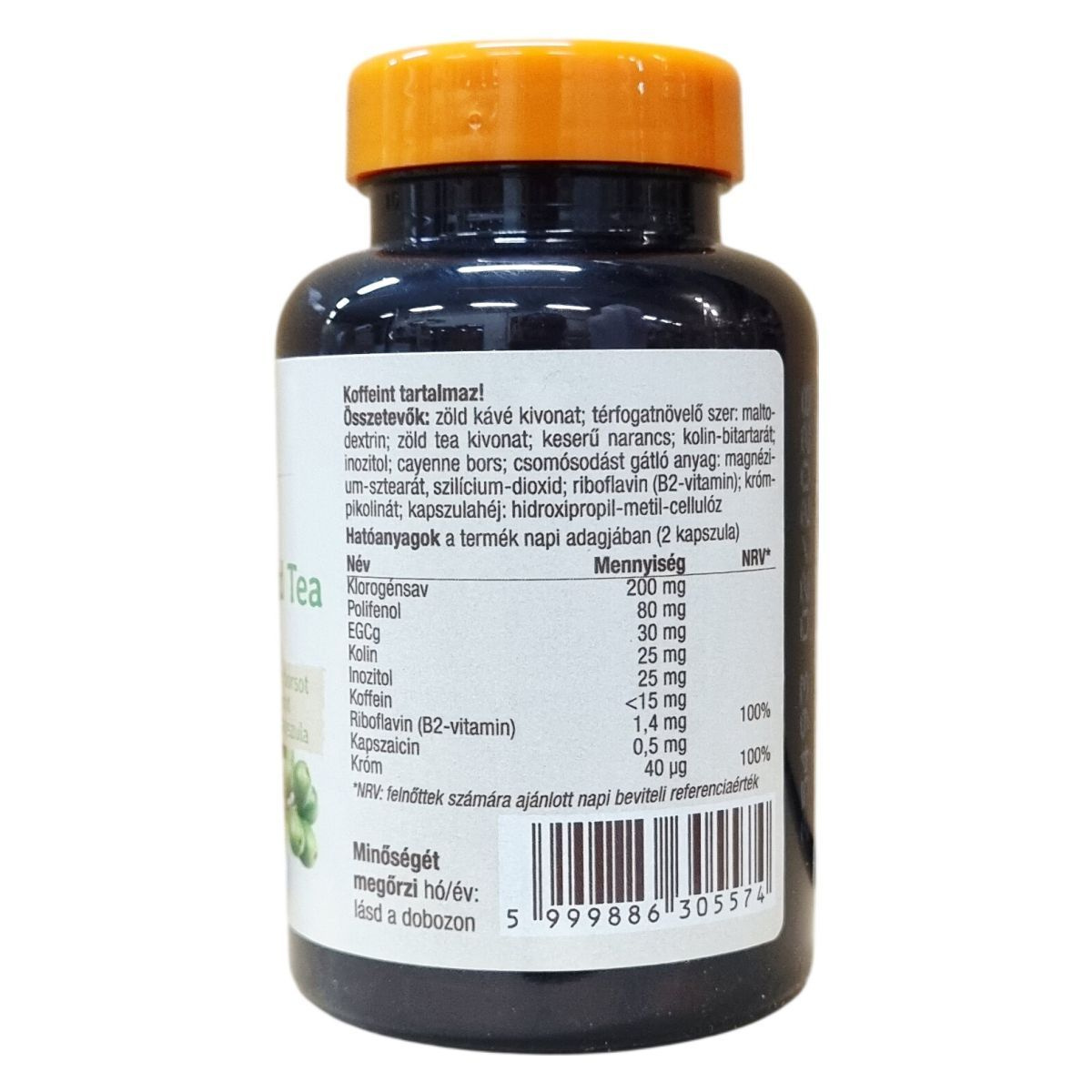zöld kávé kivonat, maltodextrin, zöld tea kivonat, keserű narancs, kolin-bitartrát, inozitol, cayenne bors, magnézium-sztearát, szilícium-dioxid, riboflavin (B2-vitamin), króm-pikolinát, hidroxipropil-metil-cellulóz