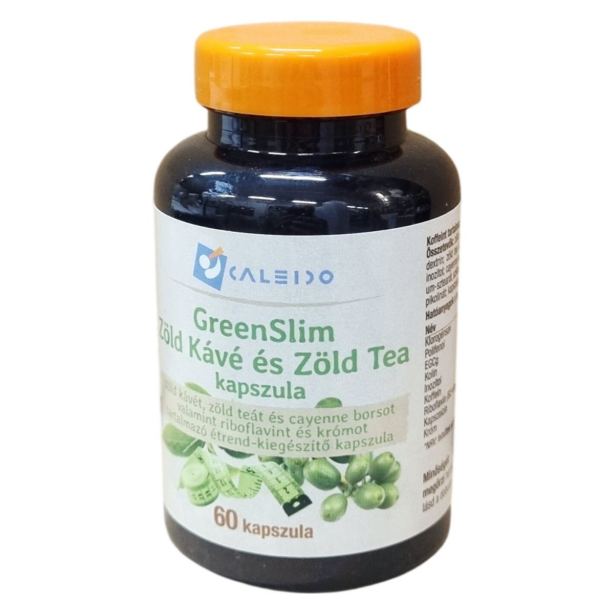 A Caleido GreenSlim készítmény zöld kávé kivonatot, zöld tea kivonatot, cayenne borsot, valamint riboflavint és krómot tartalmazó étrend-kiegészítő kapszula. Napi két kapszula bevitele javasolt, amely koffeint is tartalmaz. A termék nem ajánlott koffeinre érzékeny, terhes vagy szoptató nők, gyermekek és bizonyos egészségügyi problémákkal küzdők számára. A zöld tea az anyagcsere és a zsíranyagcsere támogatásában vehet részt, ugyanakkor az étrend-kiegészítő nem helyettesíti a kiegyensúlyozott táplálkozást és egészséges életmódot. A termék kapszulák formájában, 60 darabos kiszerelésben érhető el. Tárolása száraz, hűvös és fényvédett környezetben, gyermekektől elzárva ajánlott. A termék Spanyolországban készül.