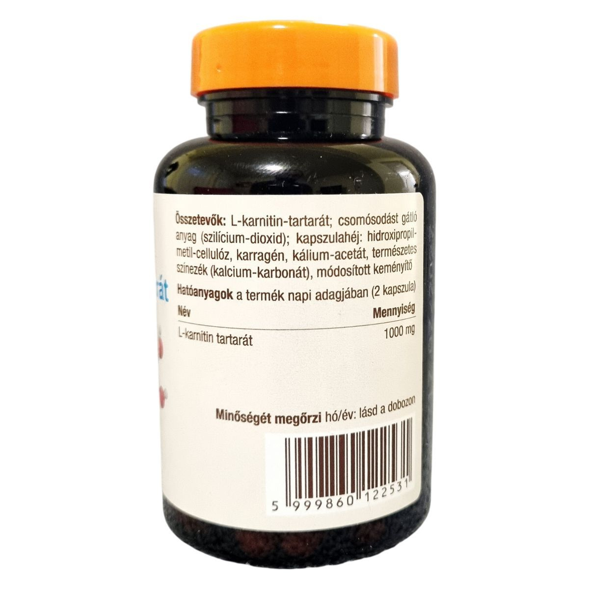 L-karnitin-tartarát, csomósodást gátló anyag (szilícium-dioxid), kapszulahéj: hidroxipropil-metil-cellulóz, karragén, kálíum-acetát, természetes színezék (kalcium-karbonát), módosított keményítő