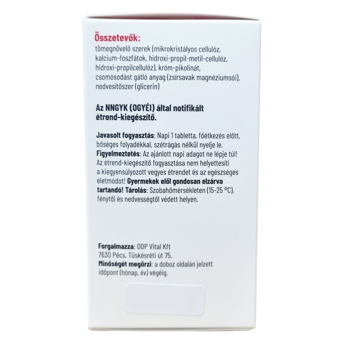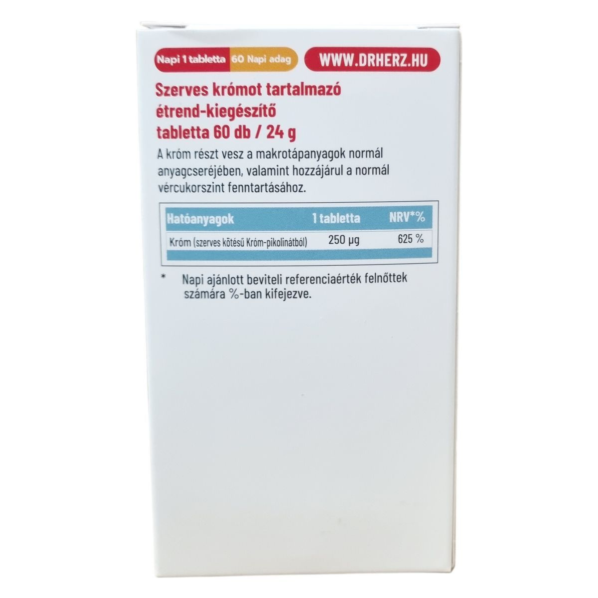 Hatóanyagok 1 kapszulában: króm: 200 µg, RDA%: 500%. RDA%: felnőttek részére ajánlott napi beviteli mennyiség.