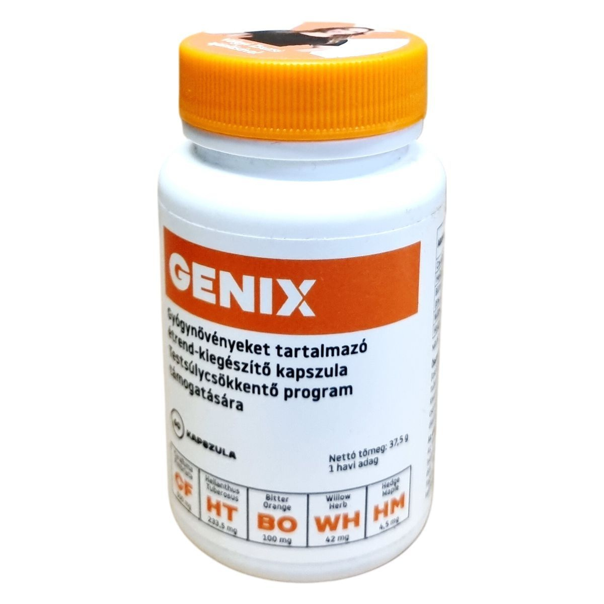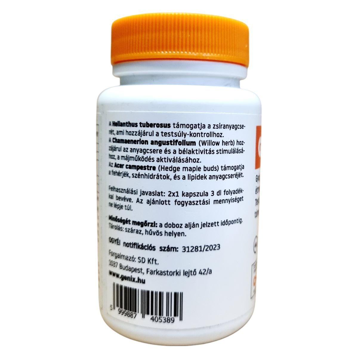 A GENIX étrend-kiegészítő kapszula különböző gyógynövények kivonatait tartalmazza, amelyek hozzájárulhatnak a testsúly-kontrollhoz és az anyagcsere támogatásához. A Helianthus tuberosus támogathatja a zsíranyagcserét, míg a Chamaenerion angustifolium (Willow herb) hozzájárulhat az anyagcsere és a bélaktivitás stimulálásához, valamint a májműködés aktiválásához. Az Acer campestre (Hedge maple buds) támogathatja a fehérjék, szénhidrátok és lipidek anyagcseréjét. A termék 60 kapszulát tartalmaz, amely egy havi adagnak felel meg. Az alapanyagok Kínából származnak.