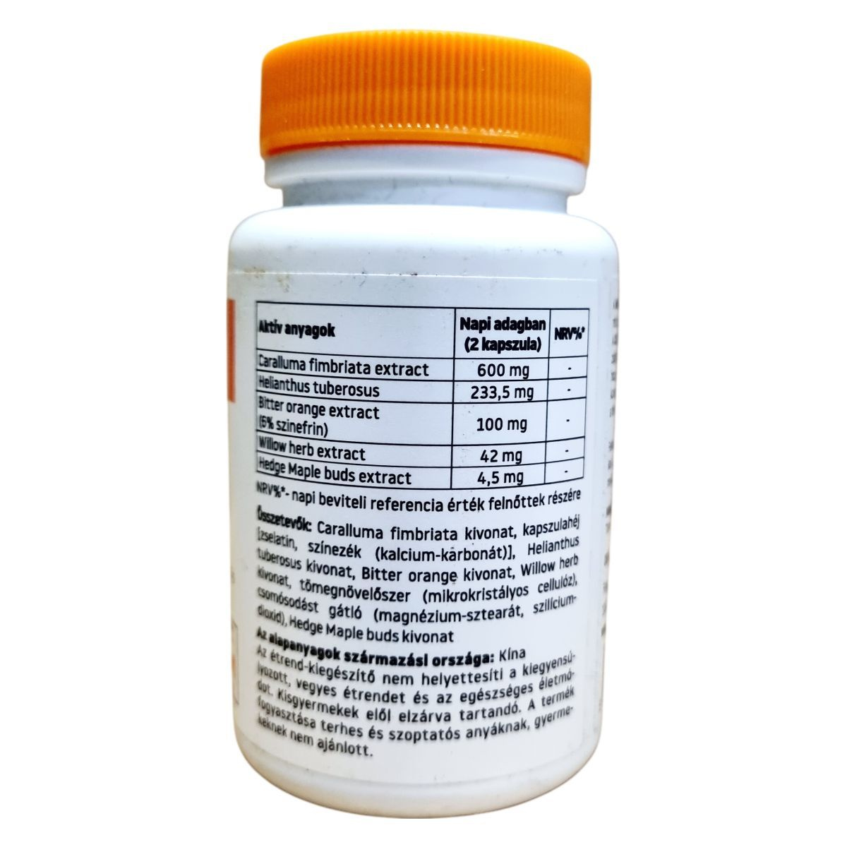 Caralluma fimbriata kivonat, kapszulahéj (zselatin, színezék (kalcium-karbonát)), Helianthus tuberosus kivonat, Bitter orange kivonat, Willow herb kivonat, tömegnövelőszer (mikrokristályos cellulóz), csomósodást gátló (magnézium-sztearát, szilícium-dioxid), Hedge Maple buds kivonat