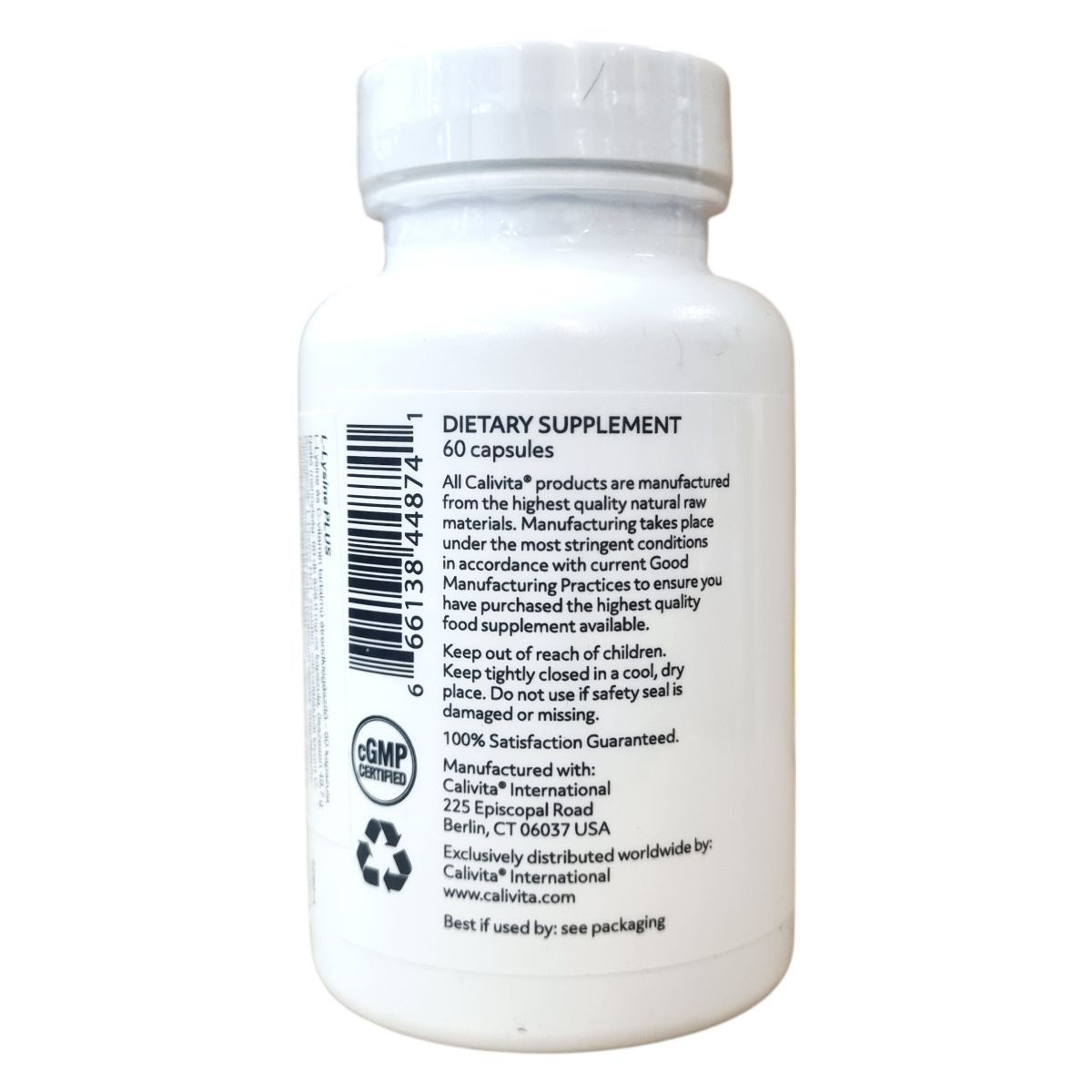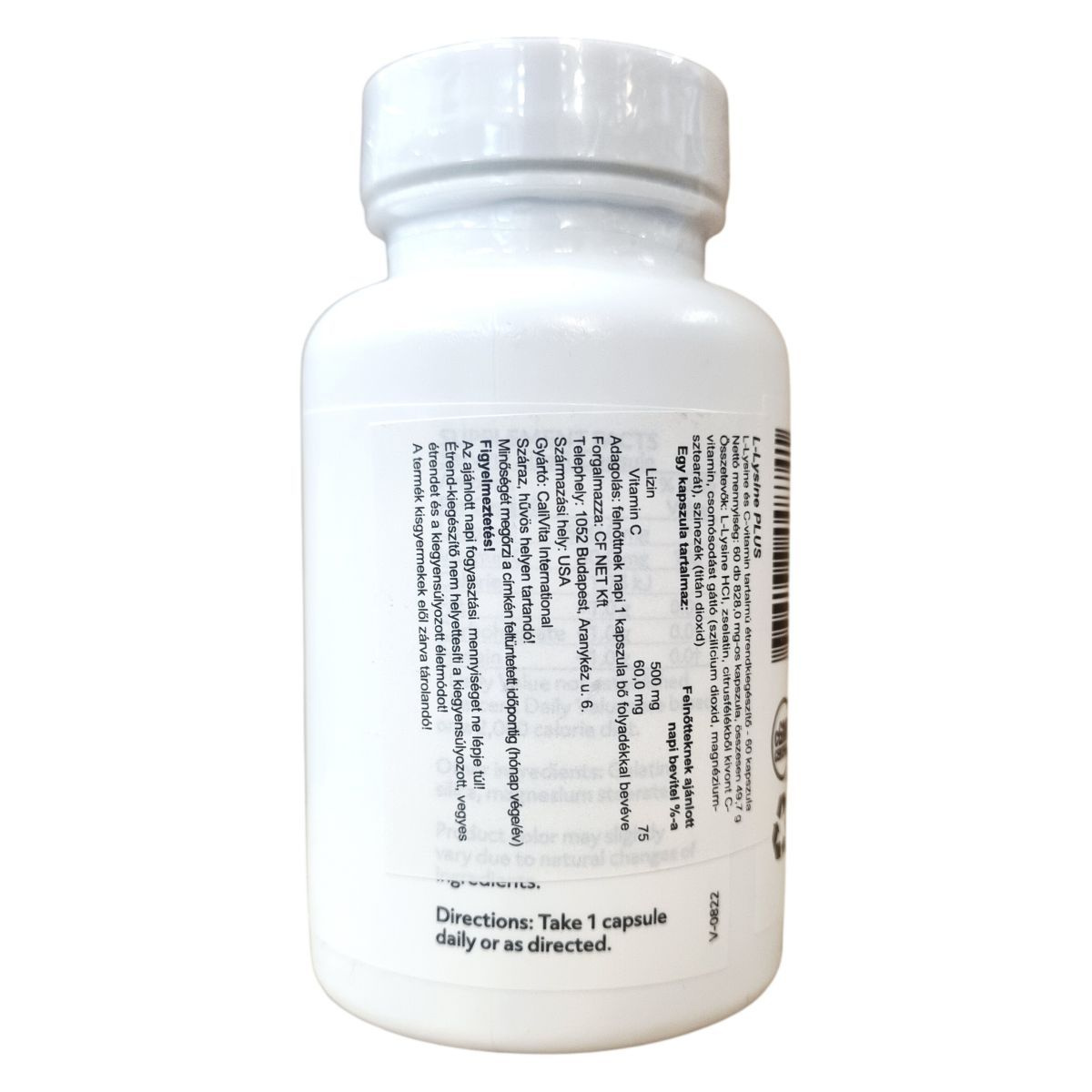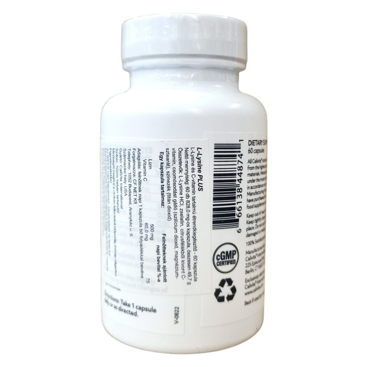 A Calivita L-Lysine PLUS termék 60 kapszulás kiszerelésben, kapszulánként 828 mg tömegben készül. A termék az egyik fő összetevője, az L-lizin mellett C-vitamint is tartalmaz, amely a citrusfélékből kerül kivonásra. A csomósodást gátló anyagok és a színezék biztosítják a kapszula minőségét és állagát. A gyártás az Egyesült Államokban, a Calivita International szigorú előírások mellett történik, betartva a cGMP szabványokat. A termék gyerekek elől elzárva tartandó, és a kapszulákat eredeti, sértetlen csomagolásban ajánlott tárolni, hogy megőrizze minőségét.