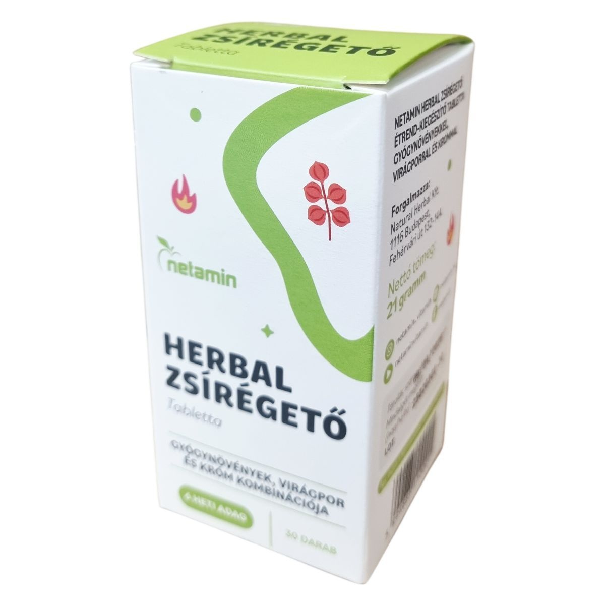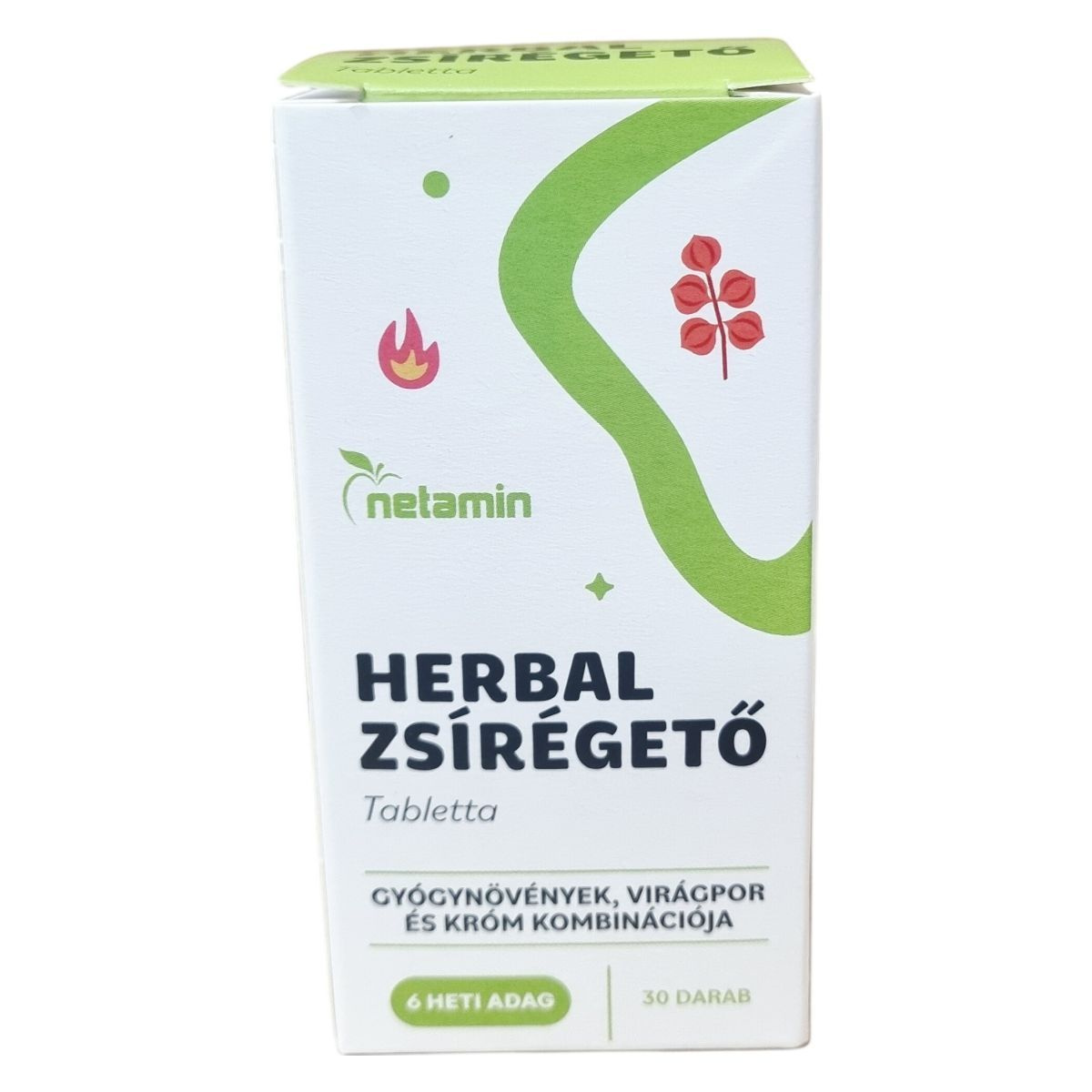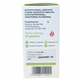 A Netamin Herbal zsírégető tabletta gyógynövényeket és virágport tartalmaz, amelyek hozzájárulhatnak a testsúlykontrollhoz és támogathatják a zsír- és szénhidrát-anyagcserét. A termék krómot, guaranát és szibériai ginzenget is tartalmazhat, amelyek segíthetnek az éhségérzet csökkentésében és a fáradtság elnyomásában.