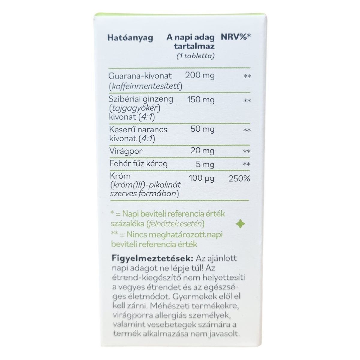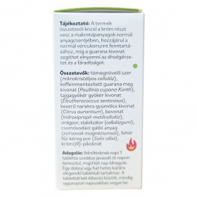tömegnövelő szer (mikrokristályos cellulóz), koffeinmentesített guarana mag kivonat (Paullinia cupana Kunth), tajgagyökér gyökér kivonat (Eleutherococcus senticosus), keserű narancs gyümölcs kivonat (Citrus aurantium), bevonat (hidroxipropil-metilcellulóz), virágpor, stabilizátor (cellulózgumi), csomósodást gátló anyag (zsírsavak magnéziumsói), fehér fűz kéreg por (Salix alba), króm(III)-pikolinát