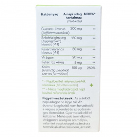Étrend-kiegészítő tabletta gyógynövényekkel, virágporral és krómmal. A króm részt vesz a makrotápanyagok normál anyagcseréjében, hozzájárul a normál vércukorszint fenntartásához, míg a guarana kivonat segíthet elnyomni az éhségérzetet és a fáradtságot. Nettó tömeg: 21 gramm. 6 heti adag, 30 darab. *Napi beviteli referencia érték százaléka (felnőttek esetén). **Nincs meghatározott napi beviteli referencia érték.