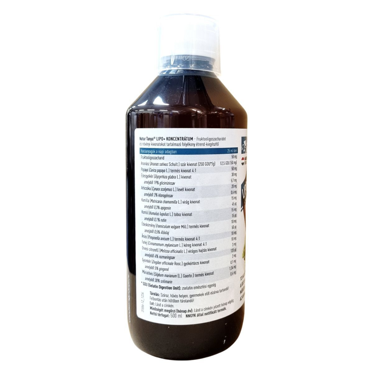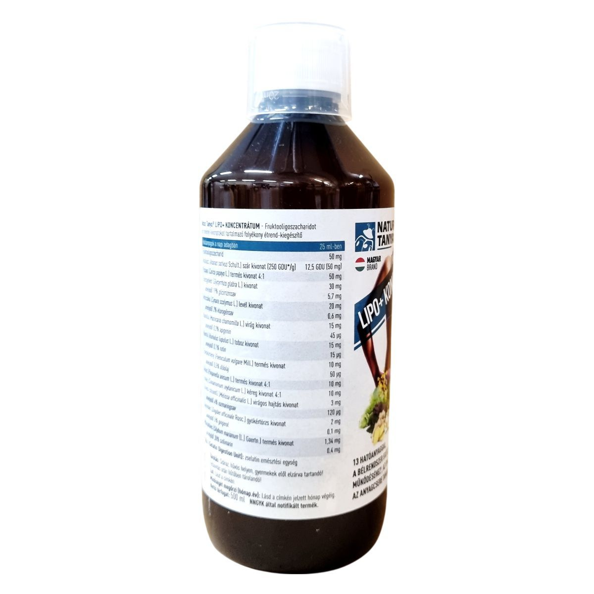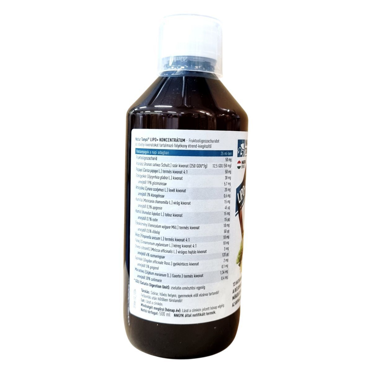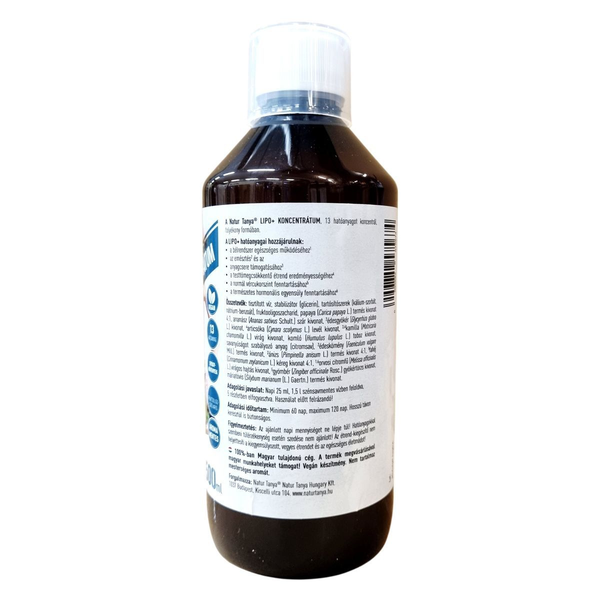 A Natur Tanya® LIPO+ KONCENTRÁTUM egy 13 hatóanyagot koncentráló, folyékony étrend-kiegészítő. Készítése során fruktooligoszacharidot és különféle növényi kivonatokat alkalmaznak, melyek között megtalálható a papaya, ananász, édesgyökér, articsóka, kamilla, komló, édeskömény, ánizs, fahéj, orvosi citromfű, gyömbér és máriatövis. A termék vegán és nem tartalmaz mesterséges aromát. Támogatni kívánja a bélrendszer egészséges működését, az emésztést és az anyagcserét, valamint hozzájárulhat a testtömegcsökkentő étrend eredményességéhez, segítheti a normál vércukorszint valamint a természetes hormonális egyensúly fenntartását. Adagolása napi 25 ml, amelyet 1,5 liter szénsavmentes vízben kell feloldani és több részletben elfogyasztani. A hosszú távú használat során is biztonságos, a javasolt adagolást azonban nem szabad túllépni. Magyar tulajdonú cég terméke, amely a hazai munkahelyek támogatását szolgálja.