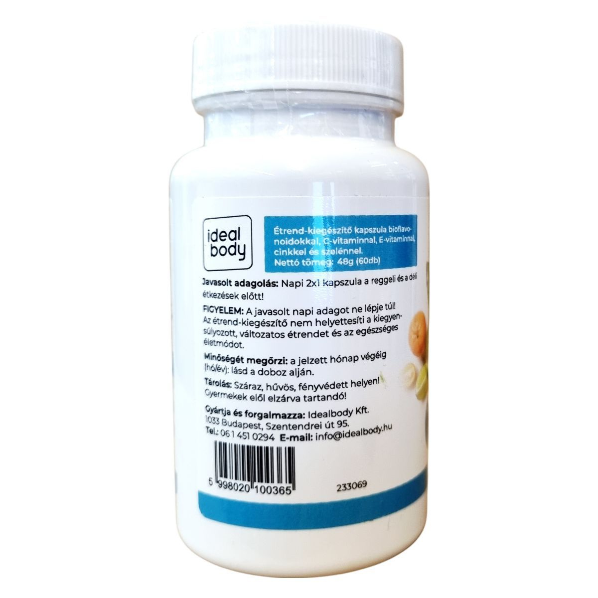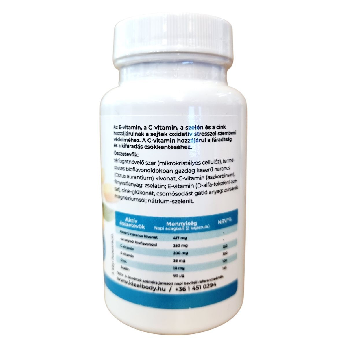 Az Idealbody Antioxidáns étrend-kiegészítő kapszula célja, hogy támogassa a sejtek védelmét az oxidatív stresszel szemben, köszönhetően az E-vitamin, a C-vitamin, a szelén és a cink tartalmának. A C-vitamin emellett hozzájárulhat a fáradtság és a kifáradás csökkentéséhez. A termék bioflavonoidokban gazdag keserű narancs kivonatot is tartalmaz, amely természetes antioxidáns forrás lehet. A kapszulák napi kétszeri fogyasztása ajánlott, a reggeli és a déli étkezések előtt. Fontos, hogy a terméket száraz, hűvös, fényvédett helyen tároljuk, és gyermekek elől elzárva tartsuk.
