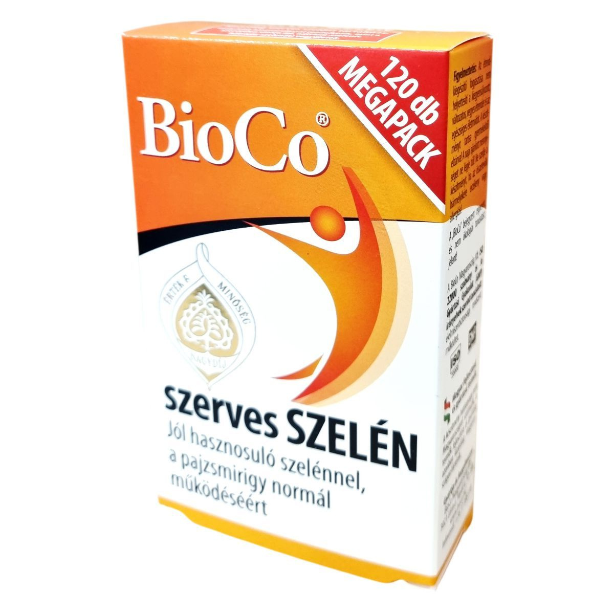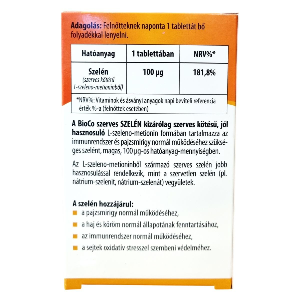 A BioCo Magyarország Kft. által magyar fejlesztéssel és gyártással készült étrend-kiegészítő kizárólag szerves kötésű L-szeleno-metioninból származó szelént tartalmaz, amely jobban hasznosul, mint a szervetlen szelénvegyületek. A 100 µg-os szelén mennyiség hozzájárulhat a pajzsmirigy normál működéséhez, a haj és köröm egészségéhez, az immunrendszer működéséhez és a sejtek oxidatív stresszel szembeni védelméhez. A gyártás és a minőségbiztosítás az ISO 22000 szabvány és GMP irányelvek szerint történik. A készítmény nem helyettesíti a változatos étrendet és az egészséges életmódot. Tartalmazhat egyéb összetevőket, például mikrokristályos cellulózt és maltodextrint, valamint csomósodást gátló anyagokat és fényző szereket.