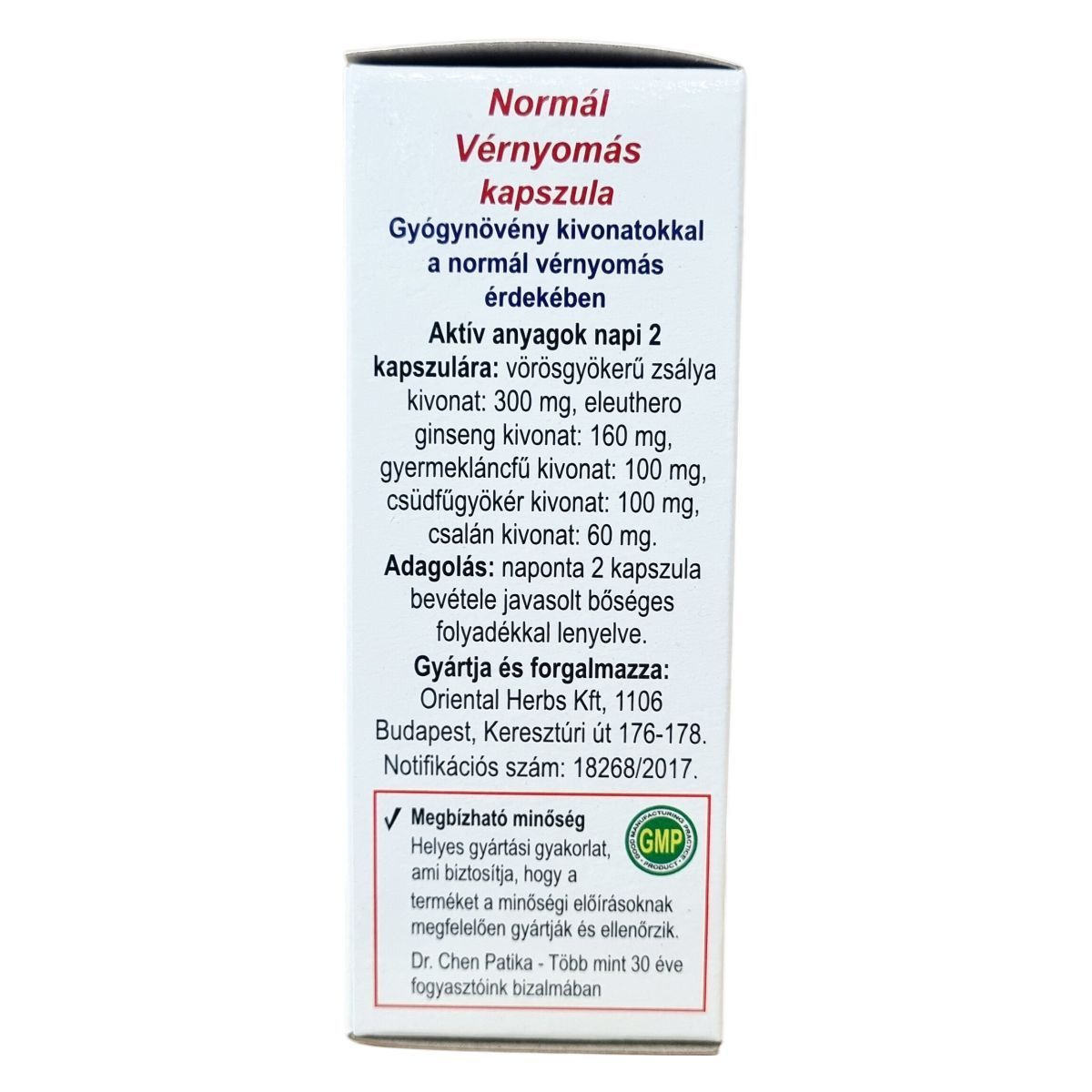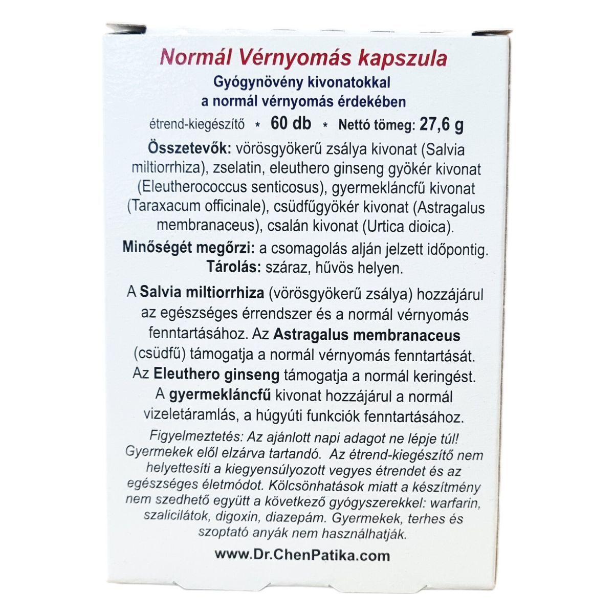 A Normál Vérnyomás kapszula többféle gyógynövény kivonatát tartalmazza, melyek hozzájárulhatnak a normál vérnyomás és a keringés fenntartásához. A vörösgyökerű zsálya támogatja az egészséges érrendszert, míg az Astragalus membranaceus a normál vérnyomás megőrzésében játszhat szerepet. Az Eleuthero ginseng a keringés támogatására szolgálhat, a gyermekláncfű pedig a normál vizeletáramlás fenntartásához járulhat hozzá. A termék megbízható minőségű és helyes gyártási gyakorlat szerint készül, megfelelve a minőségi előírásoknak. Nem helyettesíti a változatos étrendet és egészséges életmódot, használat előtt figyelembe kell venni az esetleges gyógyszerkölcsönhatásokat.