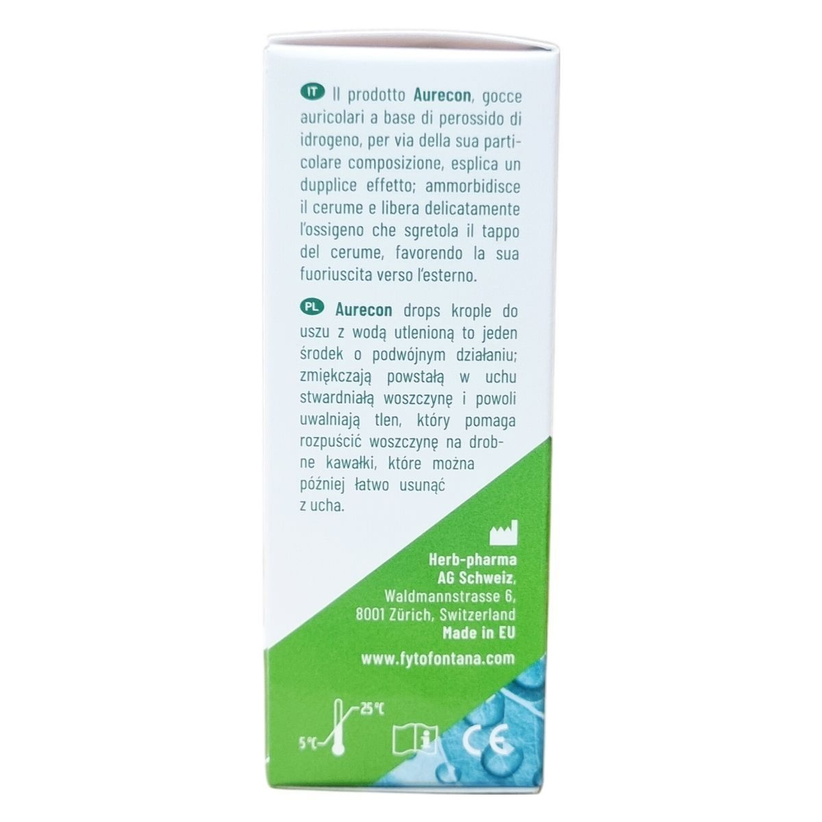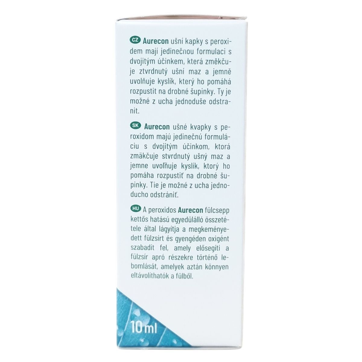 Az Aurecon peroxidos fülcsepp egyedi, kettős hatású készítmény, amely lágyítja a megkeményedett fülzsírt, majd gyengéden oxigént szabadít fel, amely segíti a fülzsír apró részekre történő lebontását. Ennek következtében a lebomlott fülzsír könnyen eltávolítható a fülből. A termék 10 ml kiszerelésben kapható, előállítása az Európai Unióban történik. A készítmény szavatossága mellett a hűtést és melegítést 5°C és 25°C között ajánlják. A gyártó Herb-pharma AG Schweiz, melynek címe Waldmannstrasse 6, 8001 Zürich, Svájc.