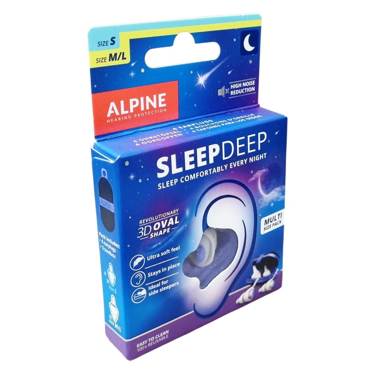 Az Alpine SleepDeep multipack ovális alakú, puha zajcsillapító maggal rendelkező füldugókat tartalmaz négy darabos kiszerelésben, amelyben két darab S, valamint két darab M/L méretű füldugó található. Az ovális forma a hallójárat természetes alakjához igazodik, így kényelmes viseletet és biztos tartást nyújt anélkül, hogy kiesne. A zajcsillapítás kiemelkedően hatékony, különösen horkolás esetén, az SNR érték 27 dB. A füldugó kivételesen puha anyaga ideálissá teszi az oldalunkon fekvők számára. Az újrafelhasználhatóság akár száz alkalommal is biztosított, így gazdaságos és környezetbarát választás. A termék szilikonmentes, könnyen tisztítható langyos szappanos vízzel, és minőségét korlátlan ideig megőrzi. A csomag praktikus tárolódobozt is tartalmaz, segítve a higiénikus tárolást. A termék FSC minősítéssel rendelkezik, mely támogatja a felelős erdőgazdálkodást.