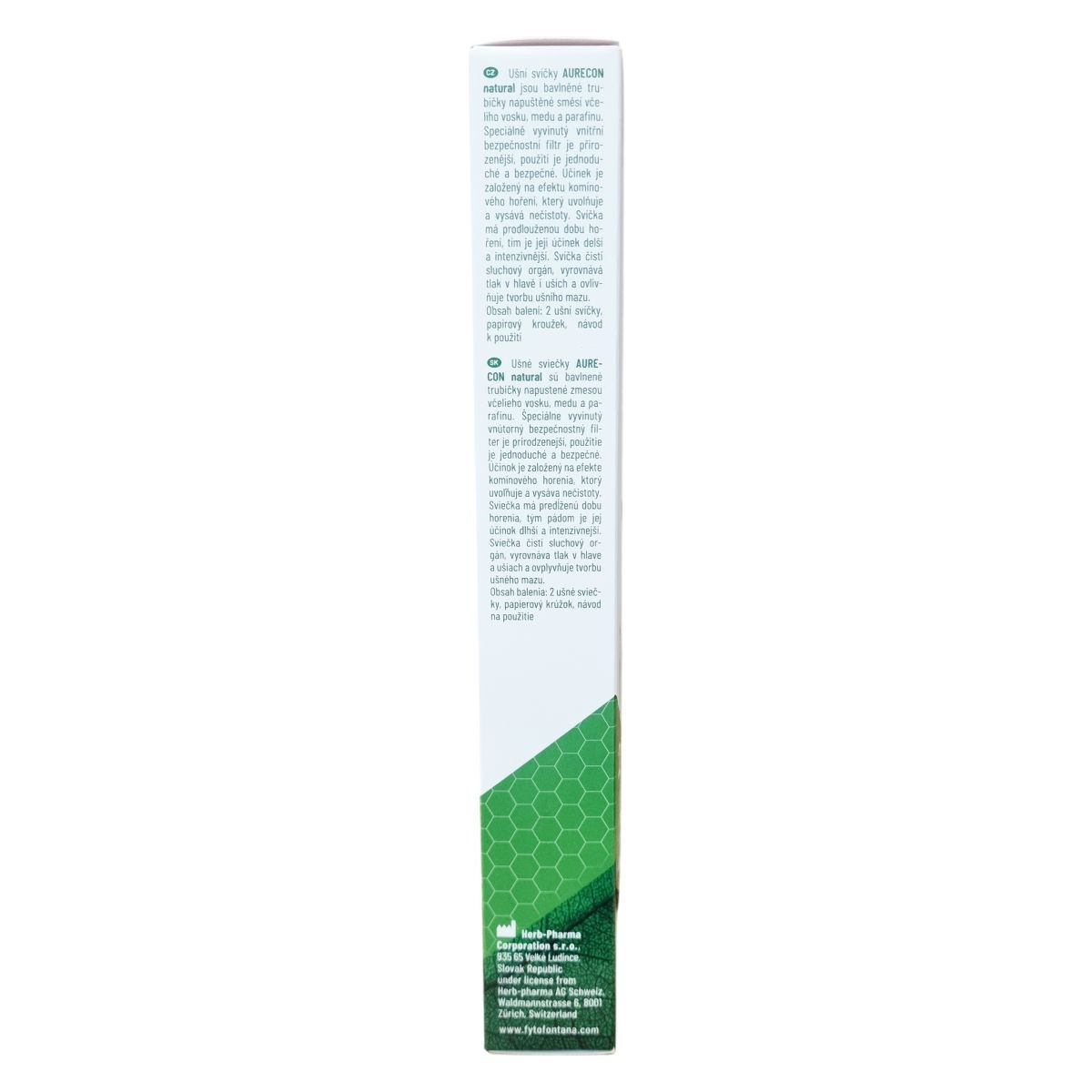 Az AURECON natural fülgyertyák pamutból készült tölcsérek, amelyeket méhviasz, méz és paraffin keverékével itattak át. A különlegesen kifejlesztett belső műanyag biztonsági szűrő növeli a természetességet, emellett biztonságossá és egyszerűvé teszi a használatot. A gyertya égési ideje hosszabb, így hatása intenzívebb és hosszabb ideig tart. A termék a kéményhatás elvén működik, amely segít az elszennyeződések oldásában és szívásában, tisztítja a hallószervet, kiegyenlíti a fej és a fül nyomását, valamint befolyásolja a fülzsír termelődését. A csomag két fülgyertyát, egy karton kört és használati útmutatót tartalmaz.