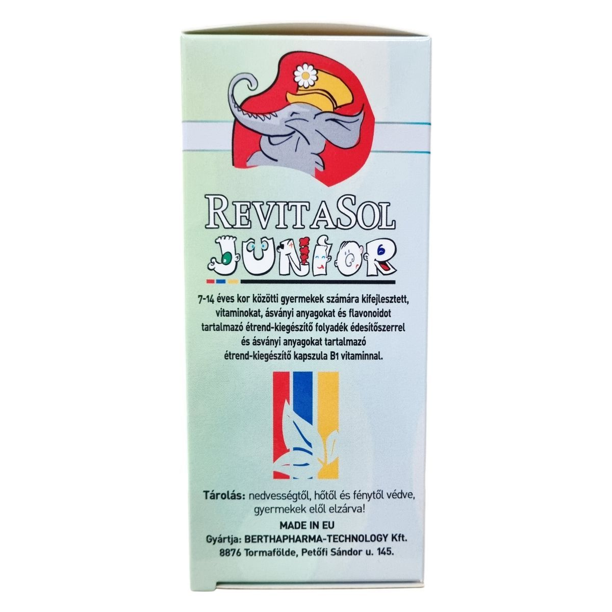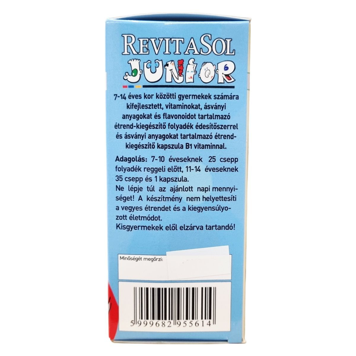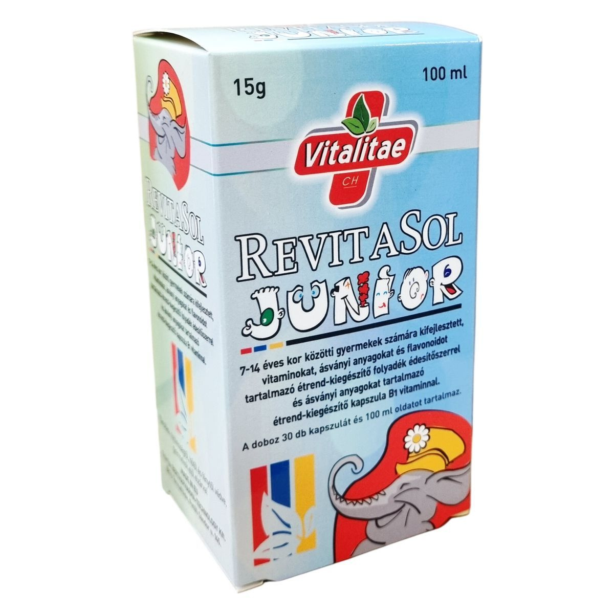 A RevitaSol Junior egy cseppentős folyadék és kapszula kombinációja, melyeket 7-14 éves gyermekek számára fejlesztettek ki. A termék vitaminokat, ásványi anyagokat és flavonoidokat tartalmaz. A doboz 30 kapszulát és 100 ml oldatot foglal magában. A folyadék édesítőszerrel készül, a kapszula pedig B1 vitamint és ásványi anyagokat tartalmaz. A terméket nedvességtől, hőtől és fénytől védve kell tárolni, gyermekek elől elzárva. A gyártás az Európai Unióban történik.