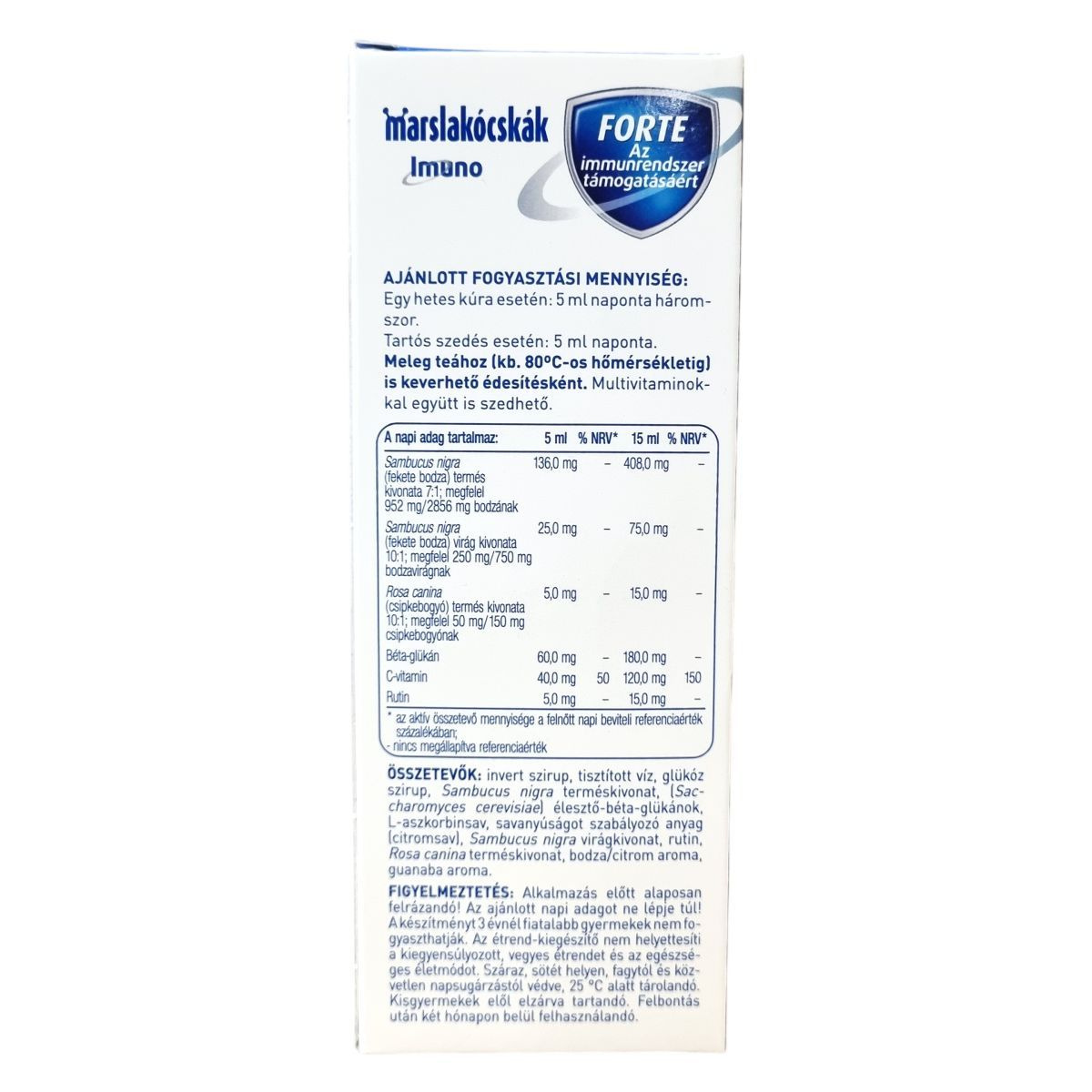 A Marslakócskák® Imuno FORTE bodzaízű étrend-kiegészítő szirup gyógynövény-kivonatokat, C-vitamint és természetes béta-glükánt tartalmaz. A fekete bodza (Sambucus nigra) hagyományos alkalmazása alapján hozzájárulhat a légutak és az immunrendszer megfelelő működéséhez. A csipkebogyó (Rosa canina) a sejtek oxidatív stresszel szembeni védelméhez, a szervezet védekezőképességének megfelelő működéséhez és a légutak egészségéhez támogató lehet. A szirup élesztőgombából származó béta-glükánt is tartalmaz, valamint C-vitamin forrása lehet, amely a normál immunműködéshez és sejtvédelemhez járulhat hozzá. Színezék- és tartósítószer-mentes termék, finom bodza ízzel.