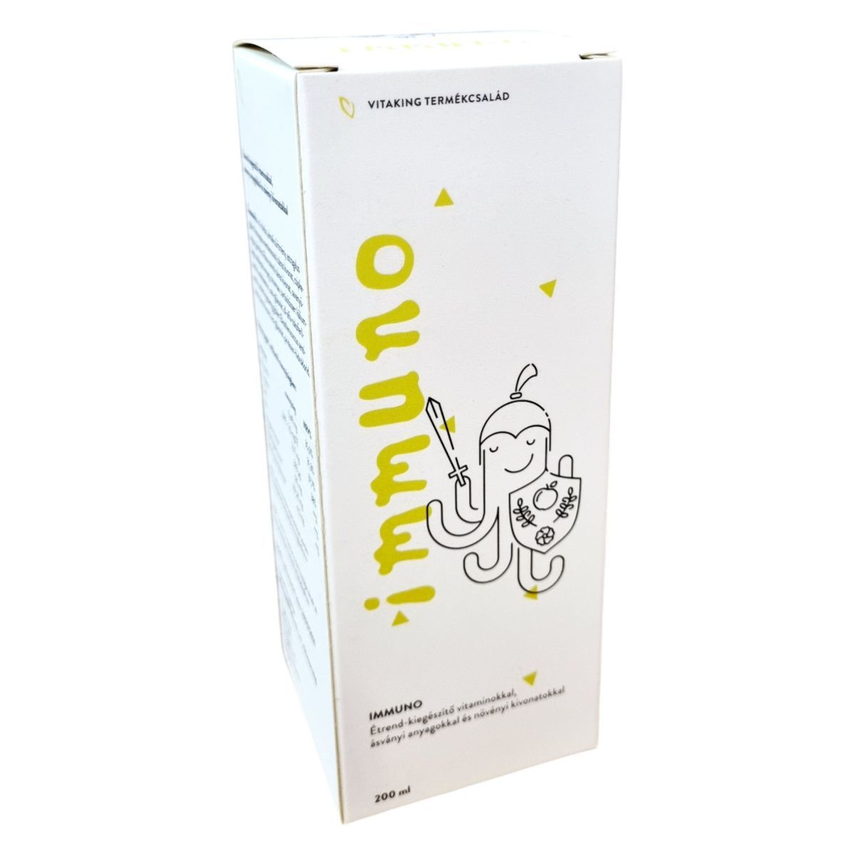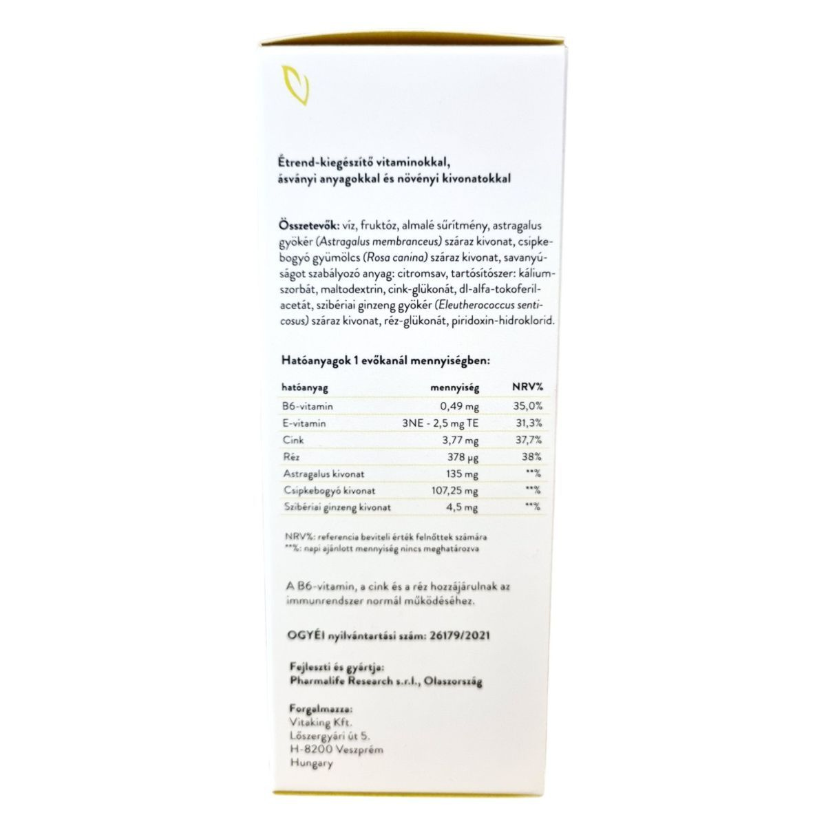 A Vitaking Immuno étrend-kiegészítő egy komplex készítmény, amely vitaminokat, ásványi anyagokat és növényi kivonatokat tartalmaz. A termék célja, hogy támogassa az immunrendszer normál működését. Az összetevők között megtalálható az astragalus gyökér, csipkebogyó gyümölcs és szibériai ginzeng, amelyek tradicionálisan használt növényi kivonatok. A B6-vitamin, cink és réz hozzájárulhatnak az immunrendszer normál működéséhez. A termék 200 ml-es kiszerelésben kapható, és napi egy evőkanál fogyasztása javasolt.