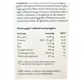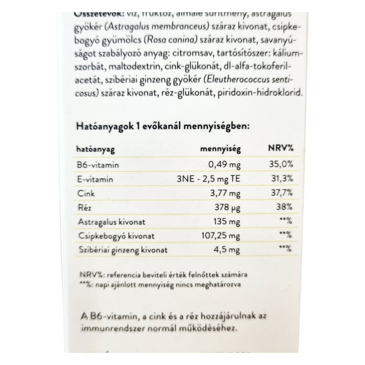 víz, fruktóz, almalé sűrítmény, astragalus gyökér száraz kivonat, csipkebogyó gyümölcs száraz kivonat, savanyúságot szabályozó anyag: citromsav, tartósítószer: kálium-szorbát, maltodextrin, cink-glükonát, dl-alfa-tokoferil-acetát, szibériai ginzeng gyökér száraz kivonat, réz-glükonát, piridoxin-hidroklorid.