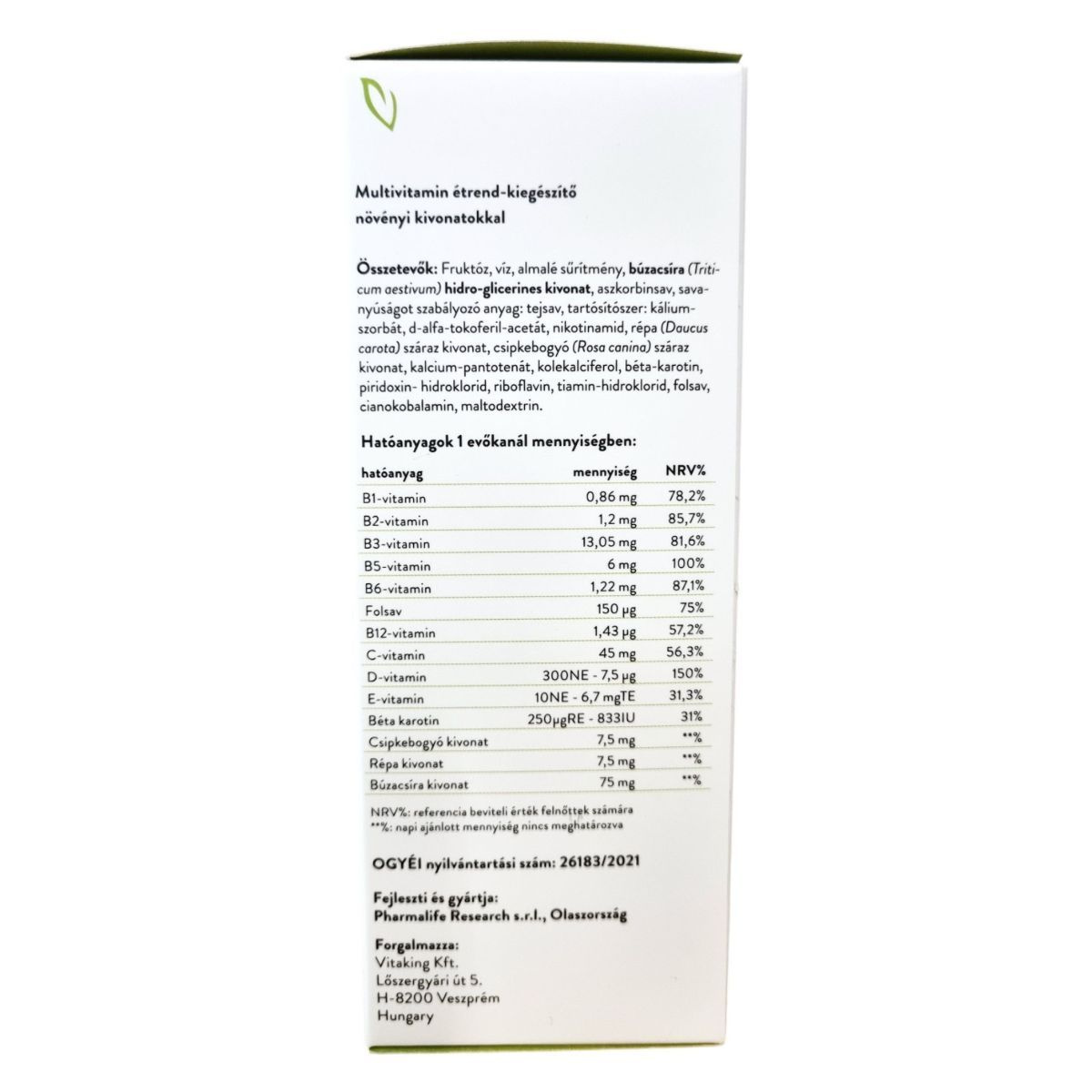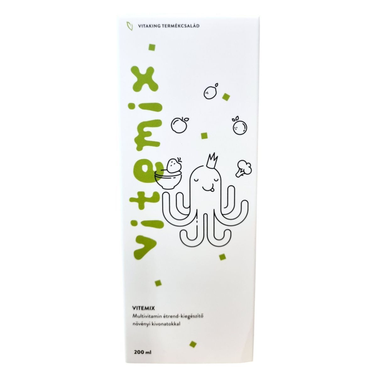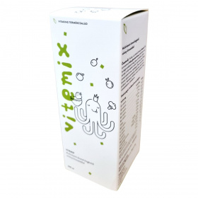 A Vitaking Vitemix multivitamin étrend-kiegészítő 200 ml-es kiszerelésben kapható, és növényi kivonatokkal gazdagított formula. A termék tartalmaz különböző vitaminokat, mint például B-vitaminok, C-vitamin, D-vitamin és E-vitamin, amelyek hozzájárulhatnak az immunrendszer támogatásához és az általános egészség fenntartásához. A termék használata előtt felrázandó, és vízzel vagy gyümölcslével hígítható. Az étrend-kiegészítő nem helyettesíti a vegyes étrendet és az egészséges életmódot, és a napi ajánlott mennyiséget nem szabad túllépni. A terméket száraz, hűvös helyen, gyermekektől elzárva kell tárolni.