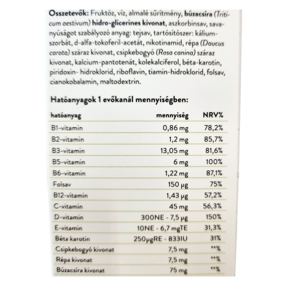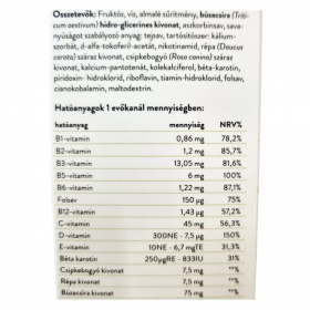 Fruktóz, víz, almalé sűrítmény, búzacsíra (Triticum aestivum) hidro-glicerines kivonat, aszkorbinsav, savanyúságot szabályozó anyag: tejsav, tartósítószer: kálium-szorbát, d-alfa-tokoferil-acetát, nikotinamid, répa (Daucus carota) száraz kivonat, csipkebogyó (Rosa canina) száraz kivonat, kalcium-pantotenát, kolekalciferol, béta-karotin, piridoxin-hidroklorid, riboflavin, tiamin-hidroklorid, folsav, cianokobalamin, maltodextrin.