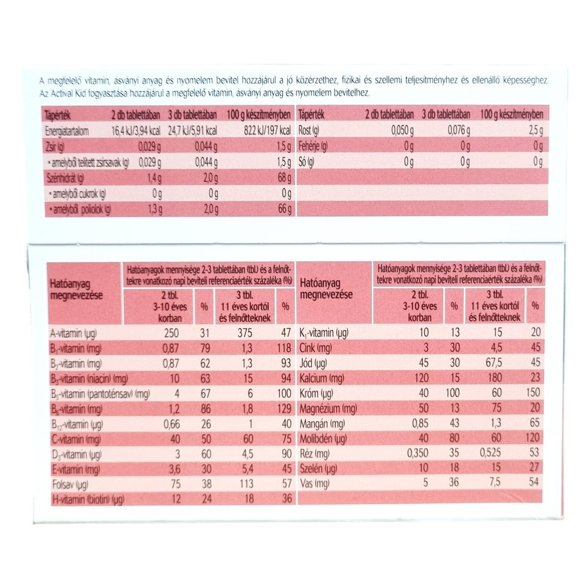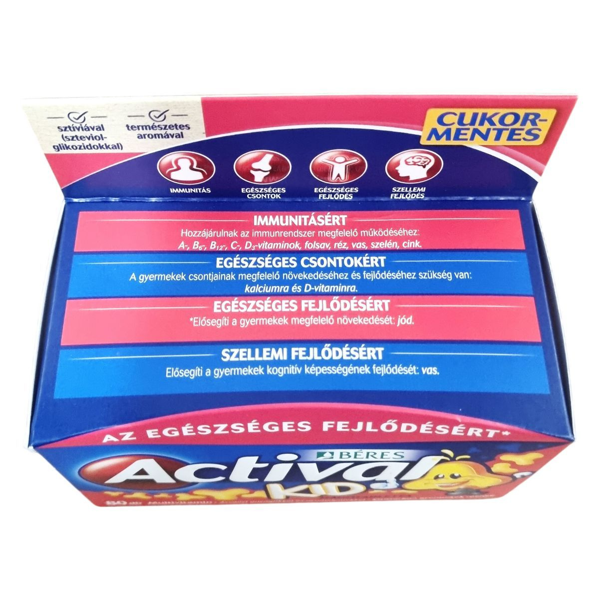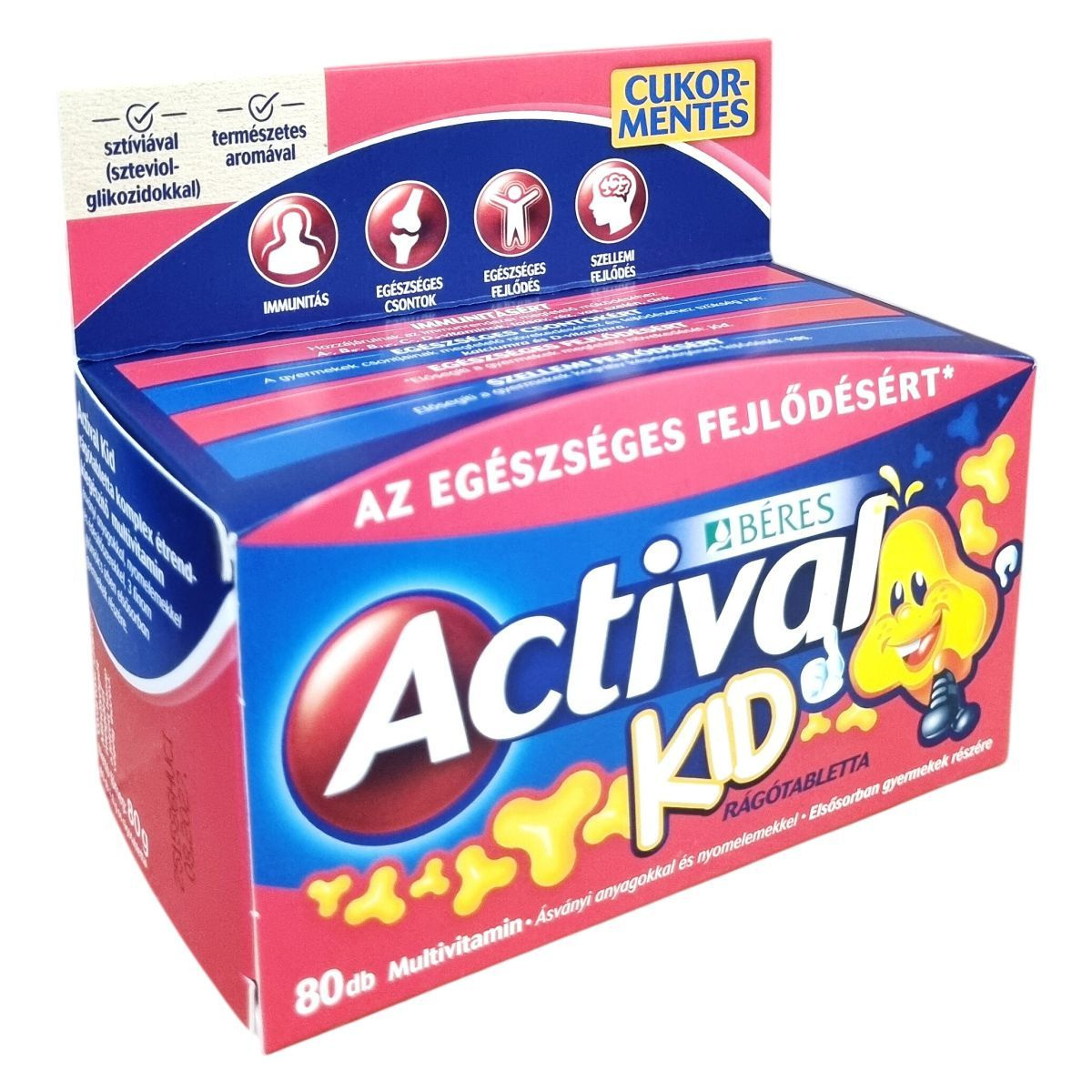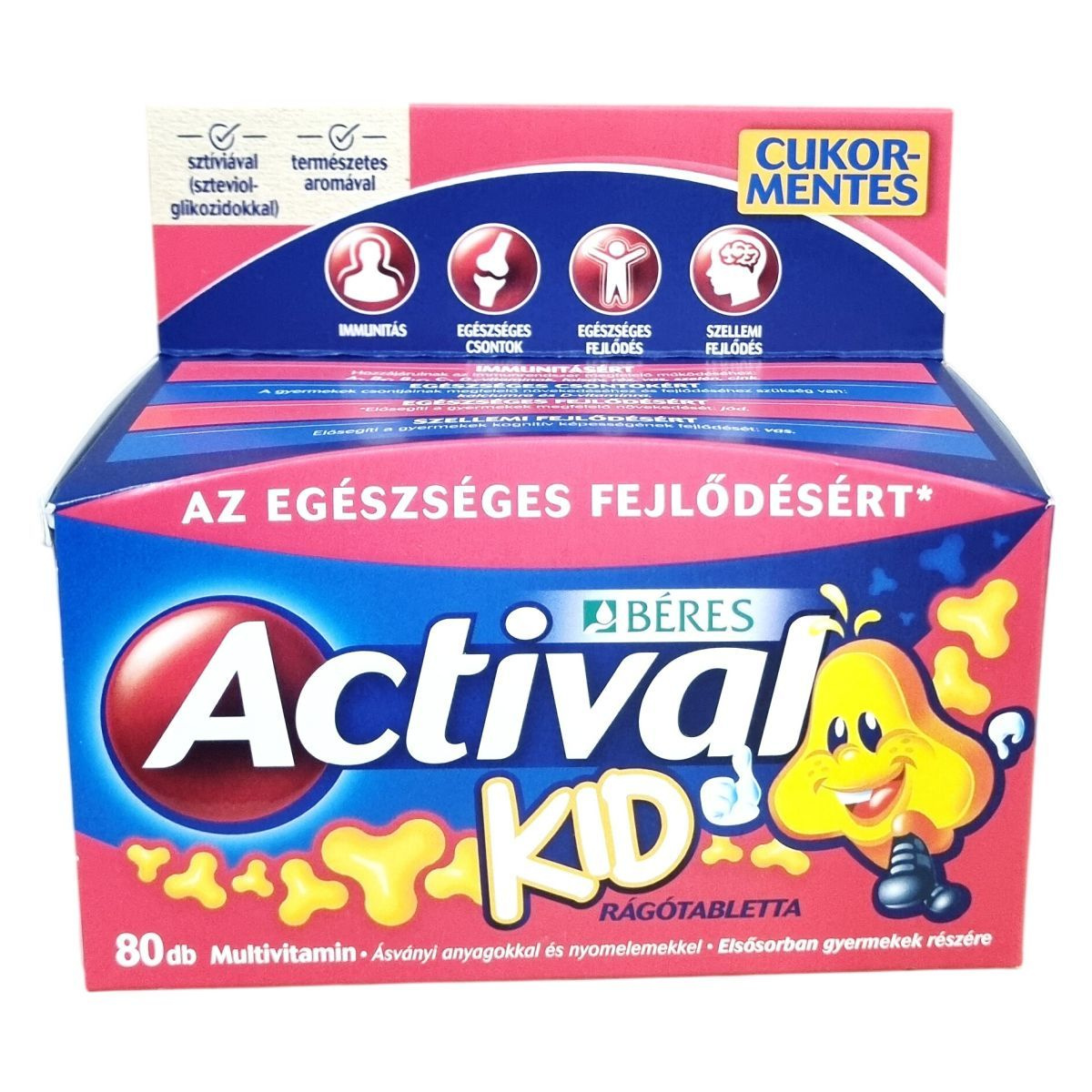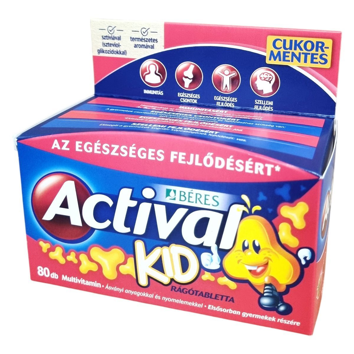 Az Actival Kid rágótabletta cukormentes, sztíviával és természetes aromákkal készül, három finom gyümölcs ízben (málna, eper, cseresznye). A készítmény elsősorban gyermekek részére készült, támogatva az immunrendszer megfelelő működését, az egészséges csontfejlődést, a gyermekek megfelelő növekedését és szellemi fejlődését különböző vitaminokkal (A, B6, B12, C, D3, folsav), ásványi anyagokkal (kalcium, magnézium, cink, mangán, vas, króm, molibdén, réz, szelén) és nyomelemekkel (jód). A termék összetétele jól összehangolt, elősegítheti a gyermek fizikai és szellemi teljesítményének támogatását. A készítményben található összetevők gondosan válogatott édesítőszereket és stabilizátorokat is tartalmaznak, melyek hozzájárulhatnak az élvezeti értékhez és a termék állagához.