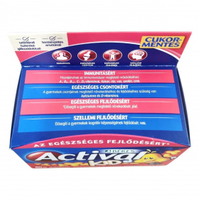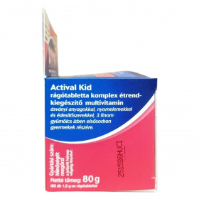 Actival Kid rágótabletta komplex étrend-kiegészítő multivitamin ásványi anyagokkal, nyomelemekkel és édesítőszerekkel, 3 finom gyümölcsös ízben, elsősorban gyermekek részére.