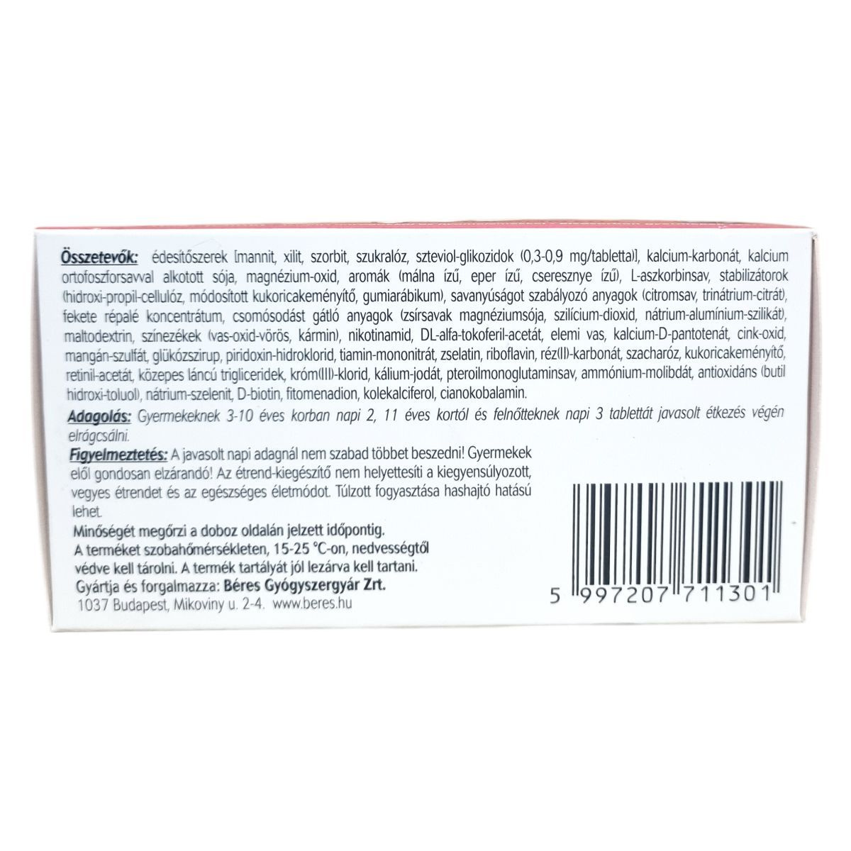 édesítőszerek (mannit, xilit, szorbit, szukralóz, szteviol-glikozidok), kalcium-karbonát, kalcium-ortofoszforsav-só, magnézium-oxid, aromák (málna, eper, cseresznye), L-aszkorbinsav, stabilizátorok (hidroxi-propil-cellulóz, módosított kukoricakeményítő, gumiarábikum), savanyúságot szabályozó anyagok (citromsav, trinátrium-citrát), fekete répalé koncentrátum, csomósodást gátló anyagok (zsírsavak magnéziumsója, szilícium-dioxid, nátrium-alumínium-szilikát), maltodextrin, színezékek (vas-oxid-vörös, kármin), nikotinamid, DL-alfa-tokoferil-acetát, elemi vas, kalcium-D-pantotenát, cink-oxid, mangán-szulfát, glükózszirup, piridoxin-hidroklorid, tiamin-mononitrát, zselatin, riboflavin, réz-karbonát, szacharóz, kukoricakeményítő, retinil-acetát, közepes láncú trigliceridek, króm-klorid, kálium-jodát, pteroilmonoglutaminsav, ammónium-molibdát, antioxidáns (butil-hidroxi-toluol), nátrium-szelenit, D-biotin, fitomenadion, kolekalciferol, cianokobalamin