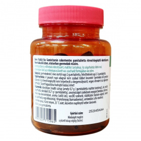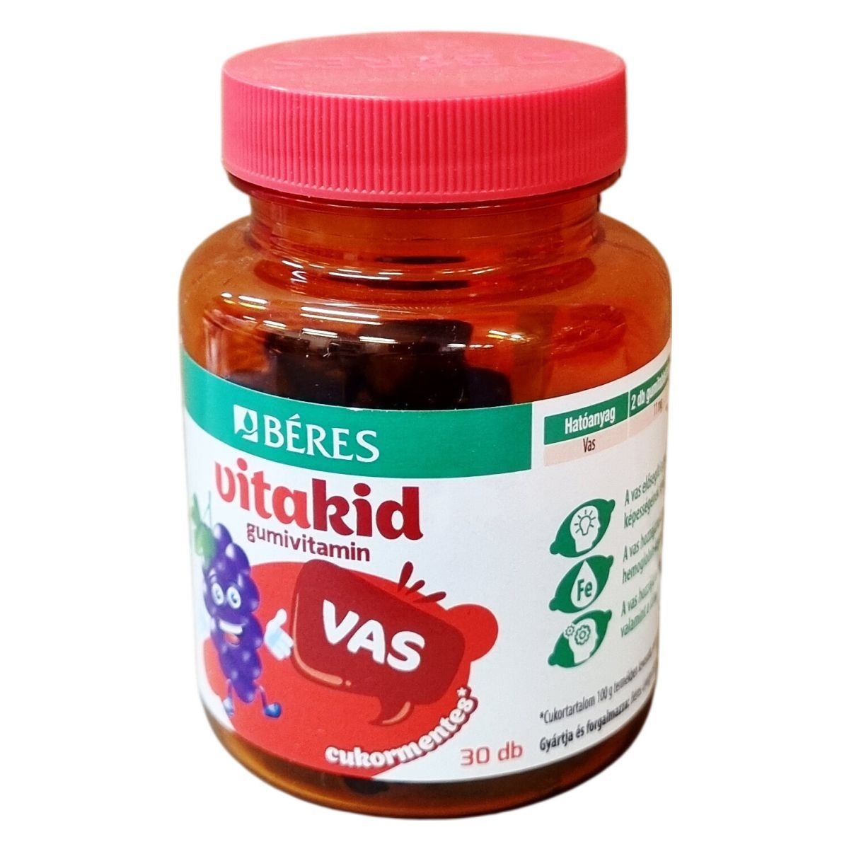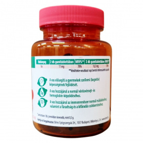 A termék felnőttekre vonatkozó napi beviteli referenciaérték százalékában (NRV) 2 gumitabletta 78% vasat, míg 3 gumitabletta 118% vasat tartalmaz. A vas elősegítheti a normál vörösvérsejt- és hemoglobin-képződést, támogatva ezáltal a szervezet megfelelő működését. A gumivitamin cukortartalma 100 g termékben kevesebb, mint 0,5 g, így cukormentesnek minősül.