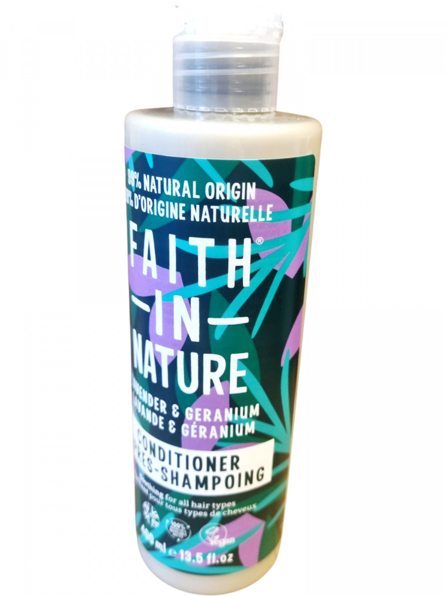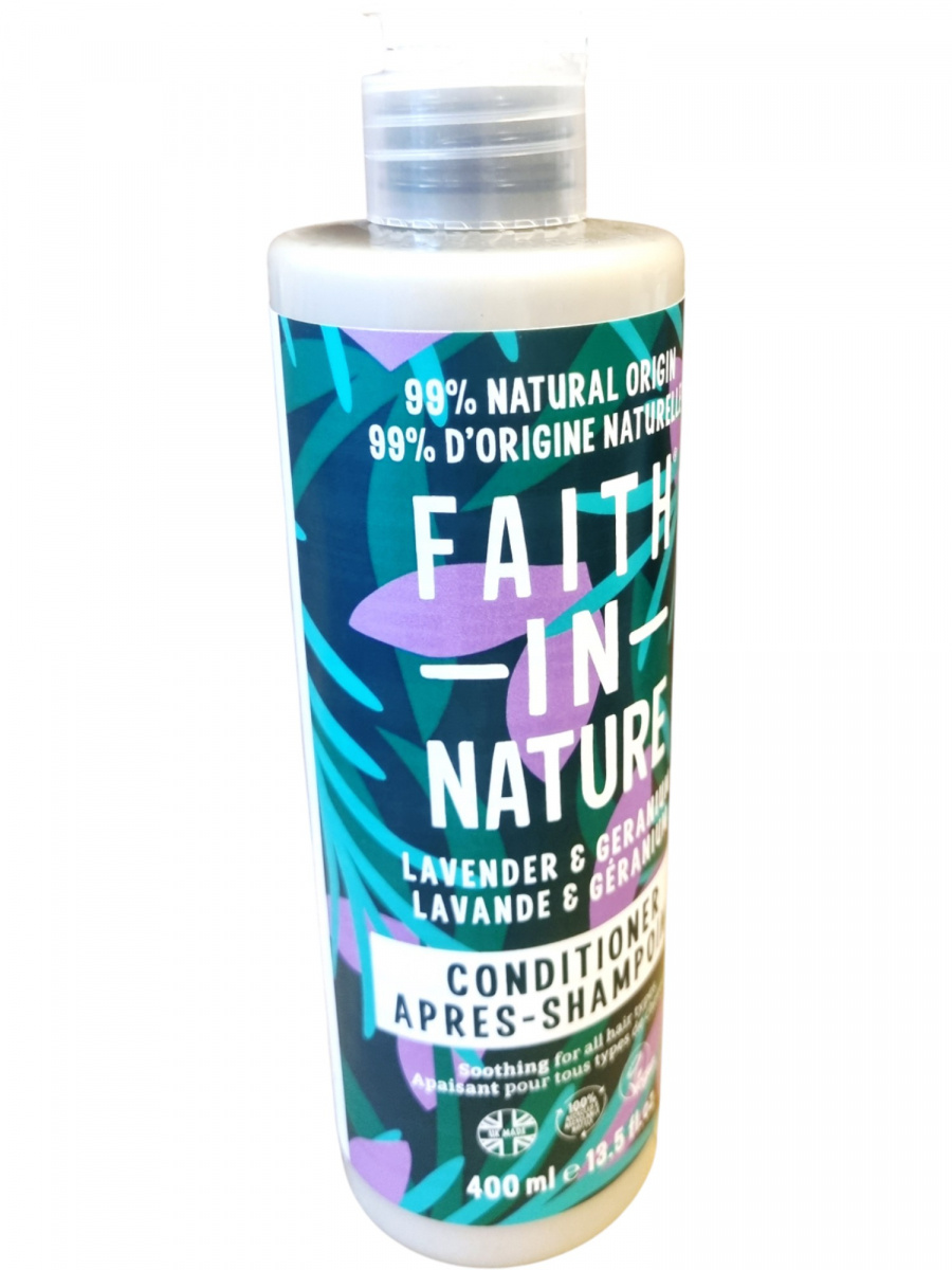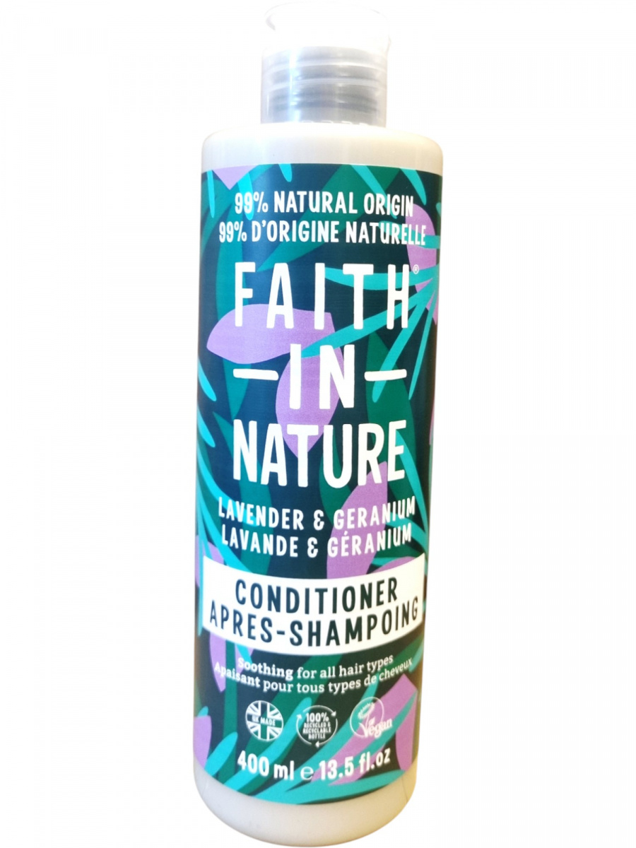 A Faith in Nature Lavender & Geranium Conditioner egy 400 ml-es kiszerelésű hajkondicionáló, amely 99%-ban természetes összetevőkből készült. A formula levendula-, geránium- és teafaolajjal gazdagított, amelyek hozzájárulhatnak a haj és fejbőr ápolásához, valamint nyugtató illatot biztosítanak. A termék vegán, állatkísérlet-mentes és újrahasznosított, valamint újrahasznosítható palackban kerül forgalomba. Alkalmas minden hajtípusra, és rendszeres használat mellett segíthet a haj puhaságának és kezelhetőségének fenntartásában.