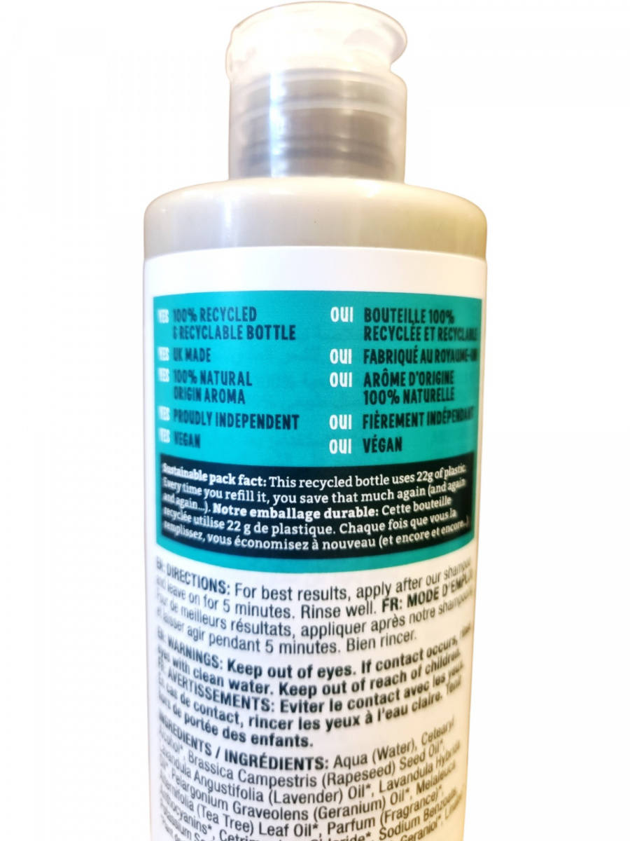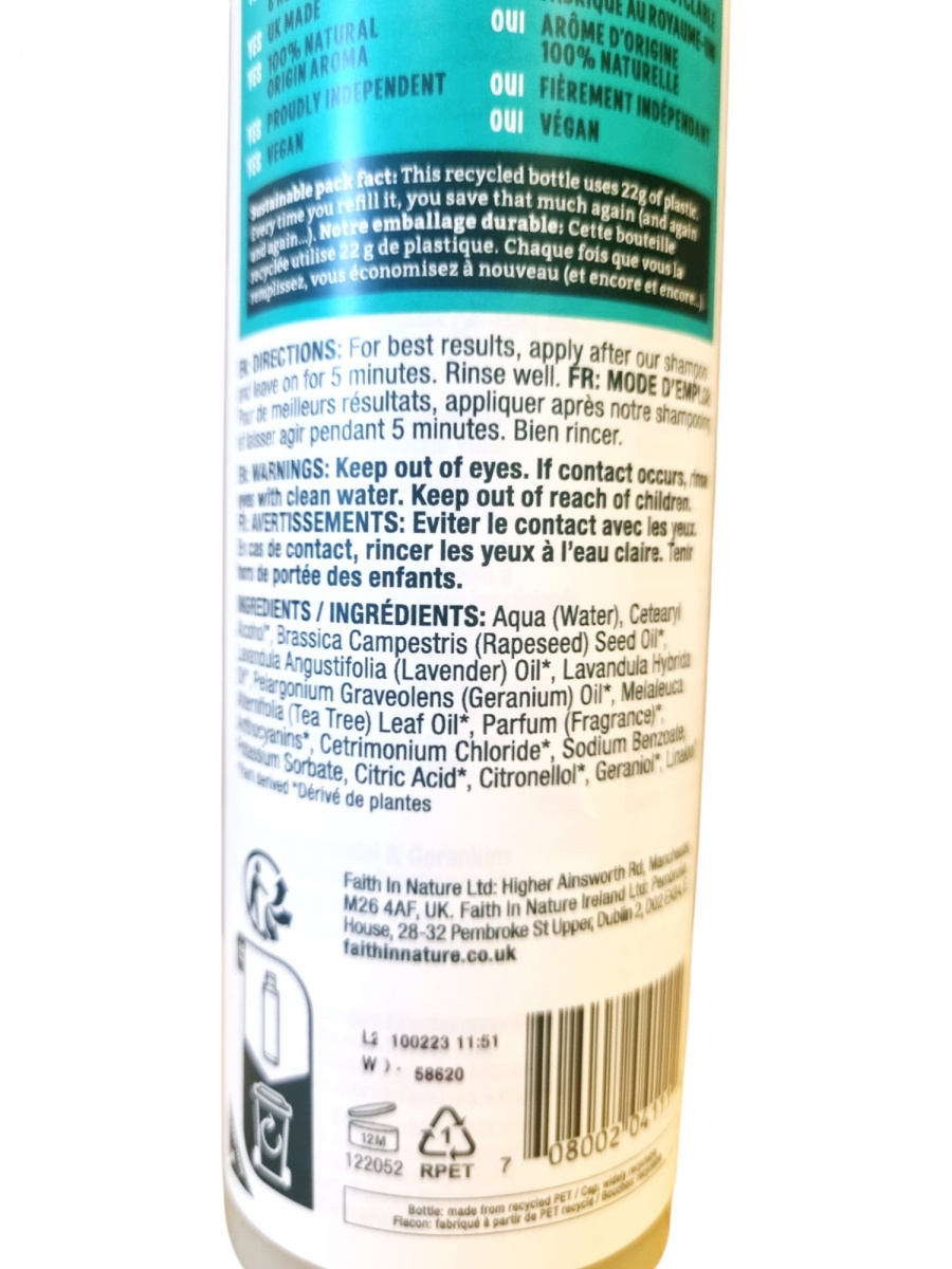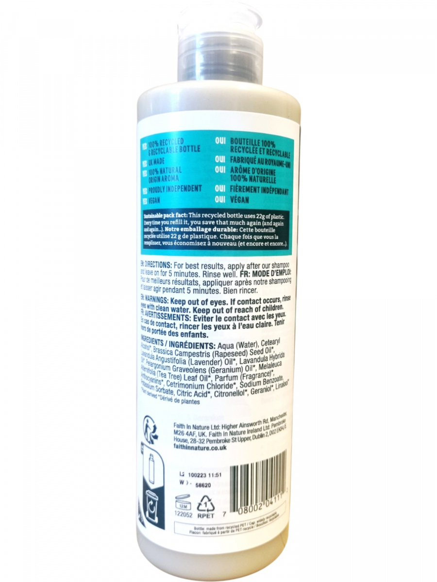 A Faith in Nature Lavender & Geranium Conditioner egy 400 ml-es kiszerelésű hajkondicionáló, amely 99%-ban természetes összetevőkből készült. A formula levendula-, geránium- és teafaolajjal gazdagított, amelyek hozzájárulhatnak a haj és fejbőr ápolásához, valamint nyugtató illatot biztosítanak. A termék vegán, állatkísérlet-mentes és újrahasznosított, valamint újrahasznosítható palackban kerül forgalomba. Alkalmas minden hajtípusra, és rendszeres használat mellett segíthet a haj puhaságának és kezelhetőségének fenntartásában.