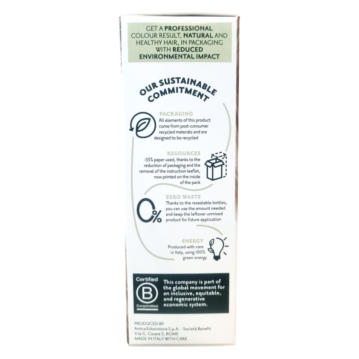 A csomagolás újrahasznosított anyagokból készül, csökkentett papírfelhasználással. Újrazárható flakonjai lehetővé teszik a maradék, nem összekevert termék későbbi felhasználását. Olaszországban gyártva, 100% zöld energiával.